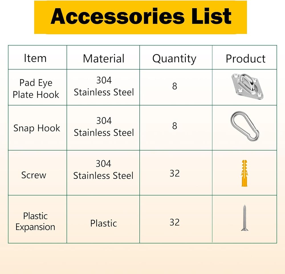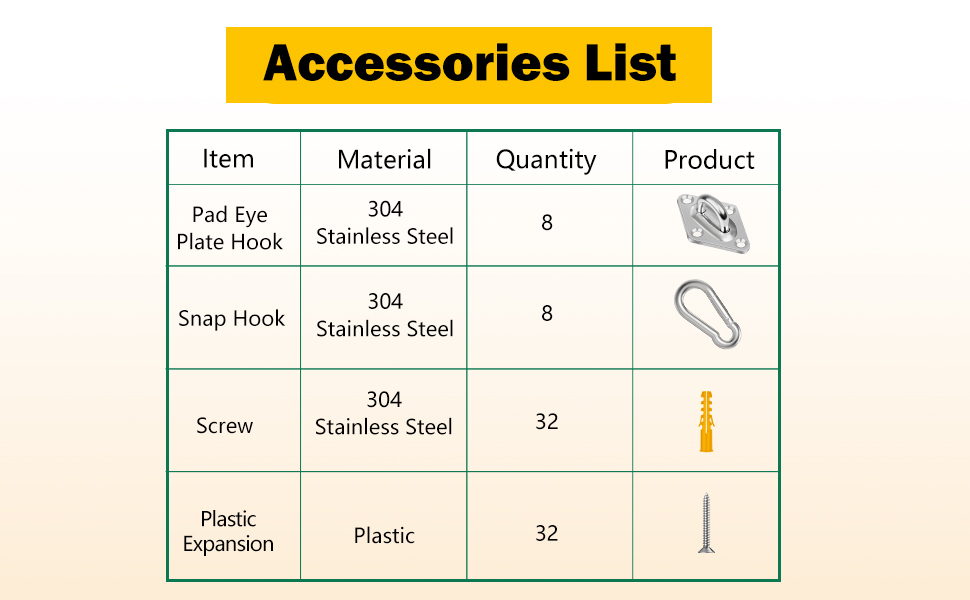 【العبوة متضمنة】8 عبوات من لوحة العين U، 8 عبوات من خطافات العين المربعة، 32 قطعة من براغي التثبيت وأنابيب التمدد.