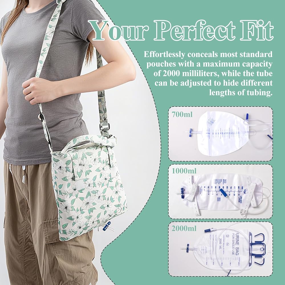 حامل حقيبة تصريف البول، حامل حقيبة القسطرة مع حزام كتف وقاعدة بسحاب، غطاء حقيبة القسطرة وحزام قابل للتعديل، مطبوعات الياسمين، يخفي أكياس تصريف البول حتى 2000 مل
