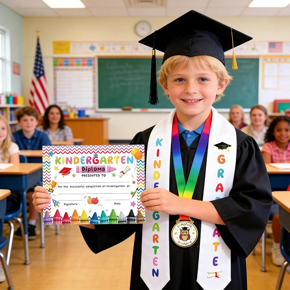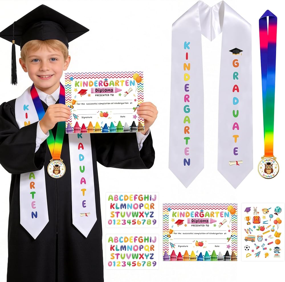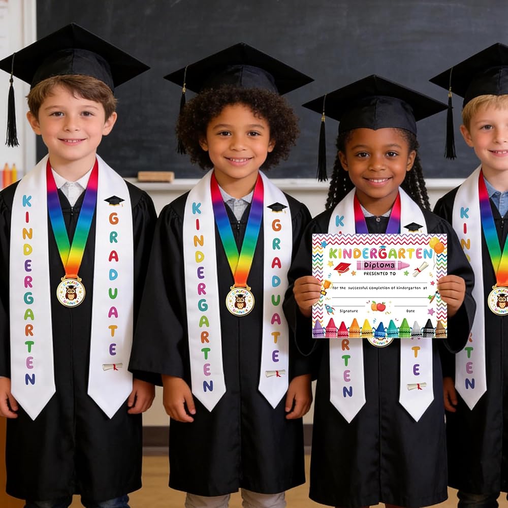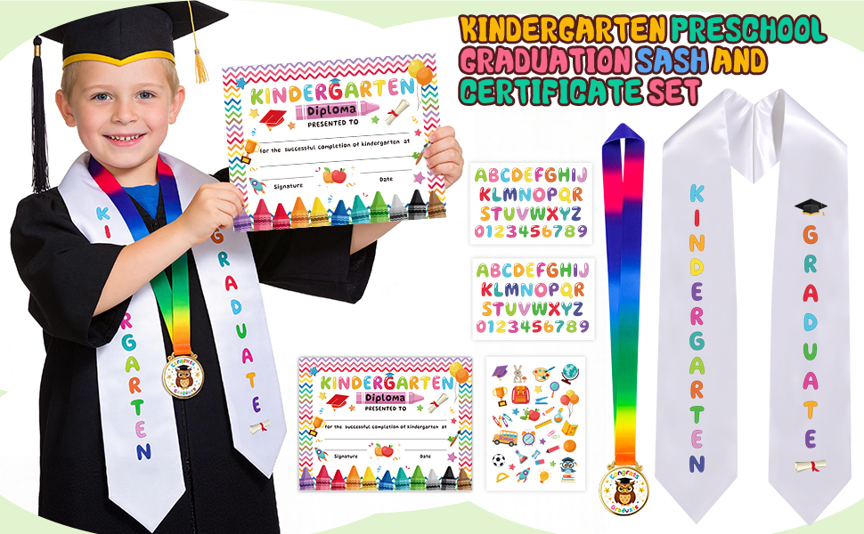 وشاح التخرج ومواد الميدالية: وشاح التخرج لرياض الأطفال الخاص بنا مصنوع من مادة الساتان المتينة التي لن تتلاشى بعد عدة غسلات. شهادات التخرج في رياض الأطفال مصنوعة من ورق سميك لا يتشوه بسهولة، والحروف المكوية مصنوعة من مواد عالية الجودة. ميداليات التخرج لرياض الأطفال مصنوعة من معدن خفيف الوزن بحواف ناعمة وتأتي مع أشرطة حريرية مريحة
