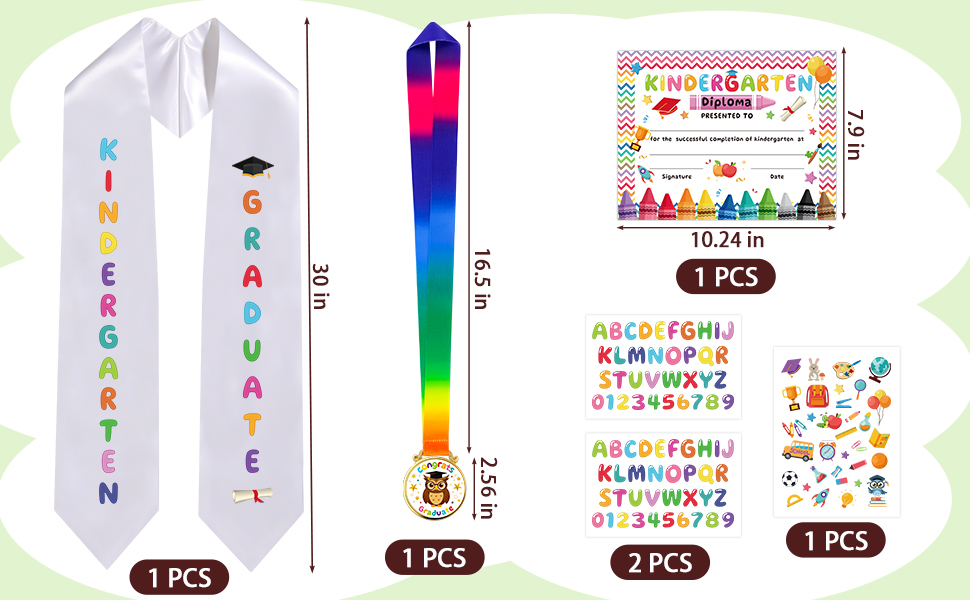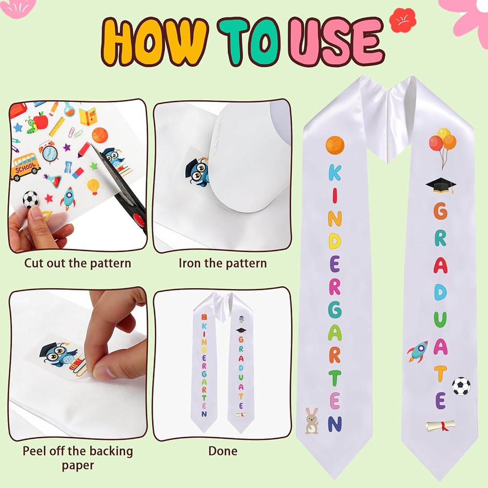 استخدام متعدد الاستخدامات للتخرج: مثالي لاحتفالات ما قبل المدرسة أو صور التخرج من رياض الأطفال أو الحفلات. قم بإضفاء الطابع الشخصي على الشالات أو القبعات أو العباءات أو الحقائب المدرسية باستخدام العناصر المضمنة لإنشاء أوشحة فريدة من نوعها لشهادة رياض الأطفال أو شهادات الدراسات العليا أو جوائز خريجي الأطفال