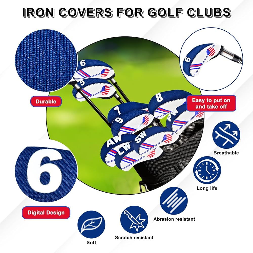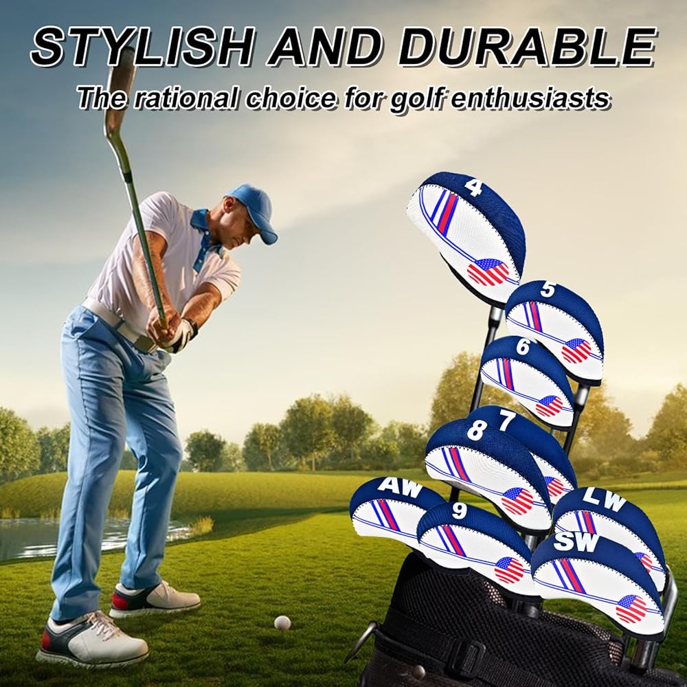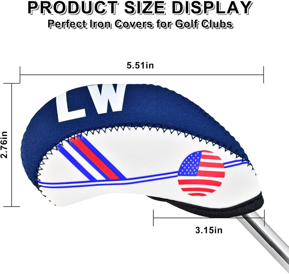 تصميم فريد: تم تصميم غطاء نادي الجولف بنمط العلم الأمريكي، وتصميم أنيق مطرز من جانب واحد، مثالي لنوادي الجولف التي تسعى إلى الموضة والعملية. أغطية حديدية لنوادي الجولف مصممة للاعبي الجولف، وهي مريحة وآمنة عند ارتدائها.