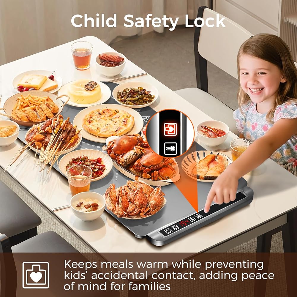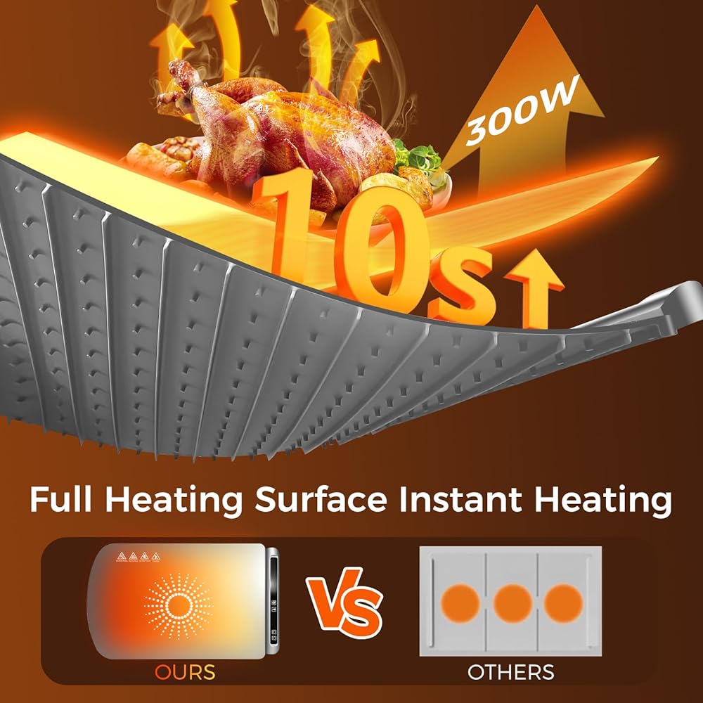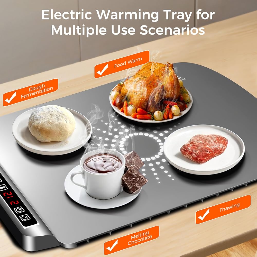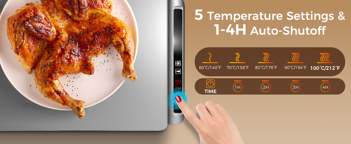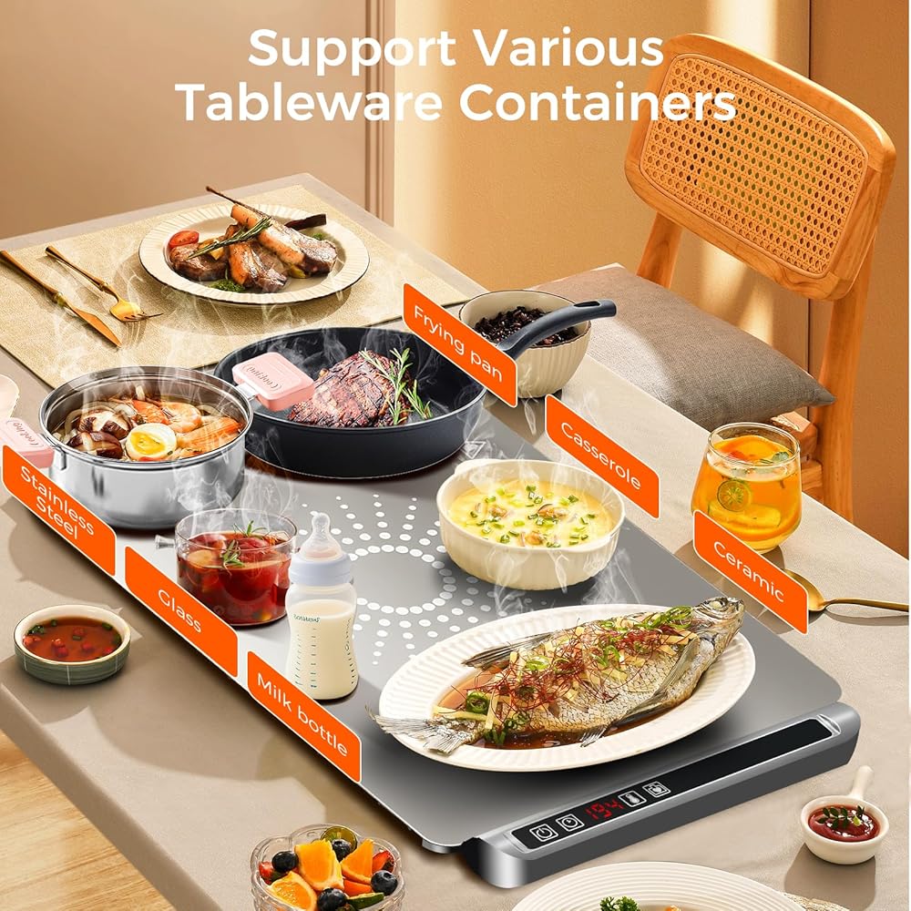 • 【درجة حرارة 5 مستويات و4 إعدادات للمؤقت】تحقق حصيرة التدفئة الكهربائية هذه تسخينًا سريعًا لمدة 10 ثوانٍ لتغطية السطح بالكامل بالتساوي، ولا تترك أي بقع باردة. مع 5 إعدادات لدرجة الحرارة (140 درجة فهرنهايت - 212 درجة فهرنهايت) و4 مؤقتات (1-4 ساعات)، تتيح لك وسادة تسخين الطعام ضبط الدفء بدقة للأطباق المختلفة. تحافظ سجادة تدفئة الطعام على الطعام في درجة الحرارة المثالية أثناء الوجبات اليومية. وفي التجمعات، فإنه يزيل المتاعب والفوضى الناجمة عن إعادة التسخين المتكرر