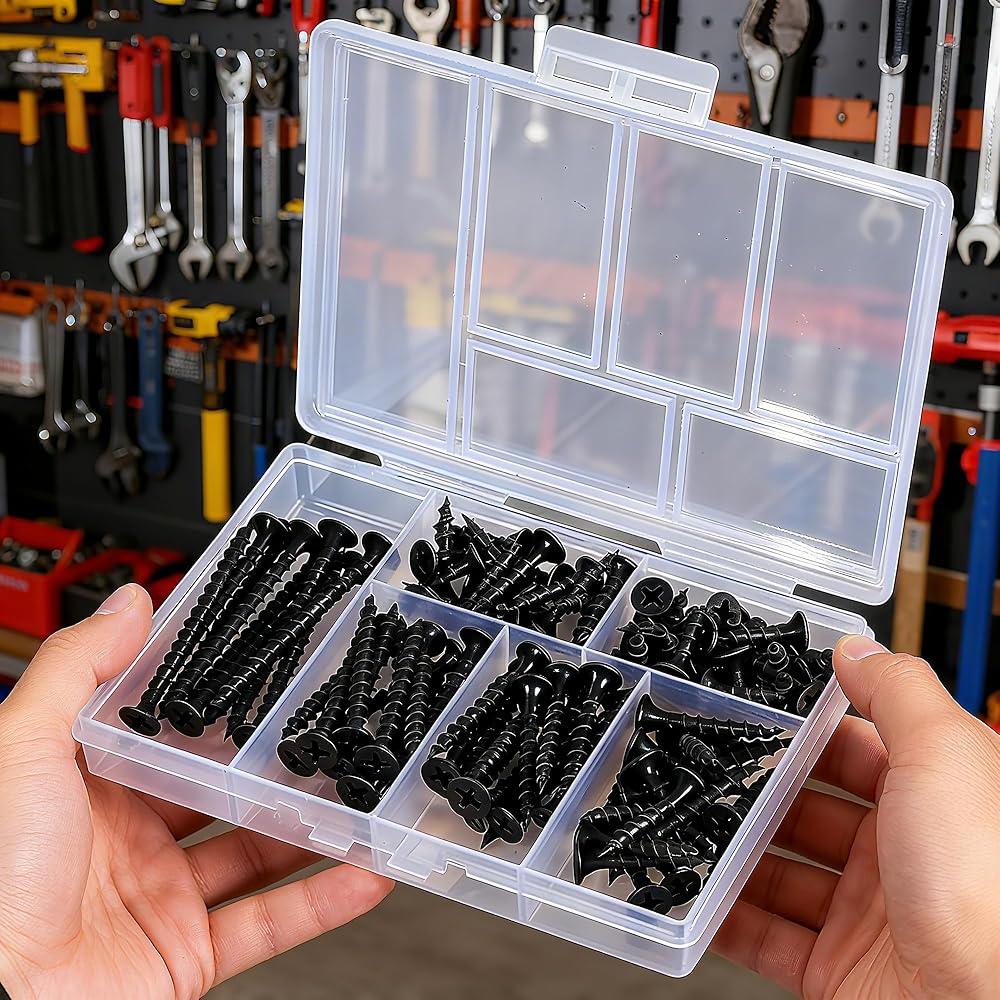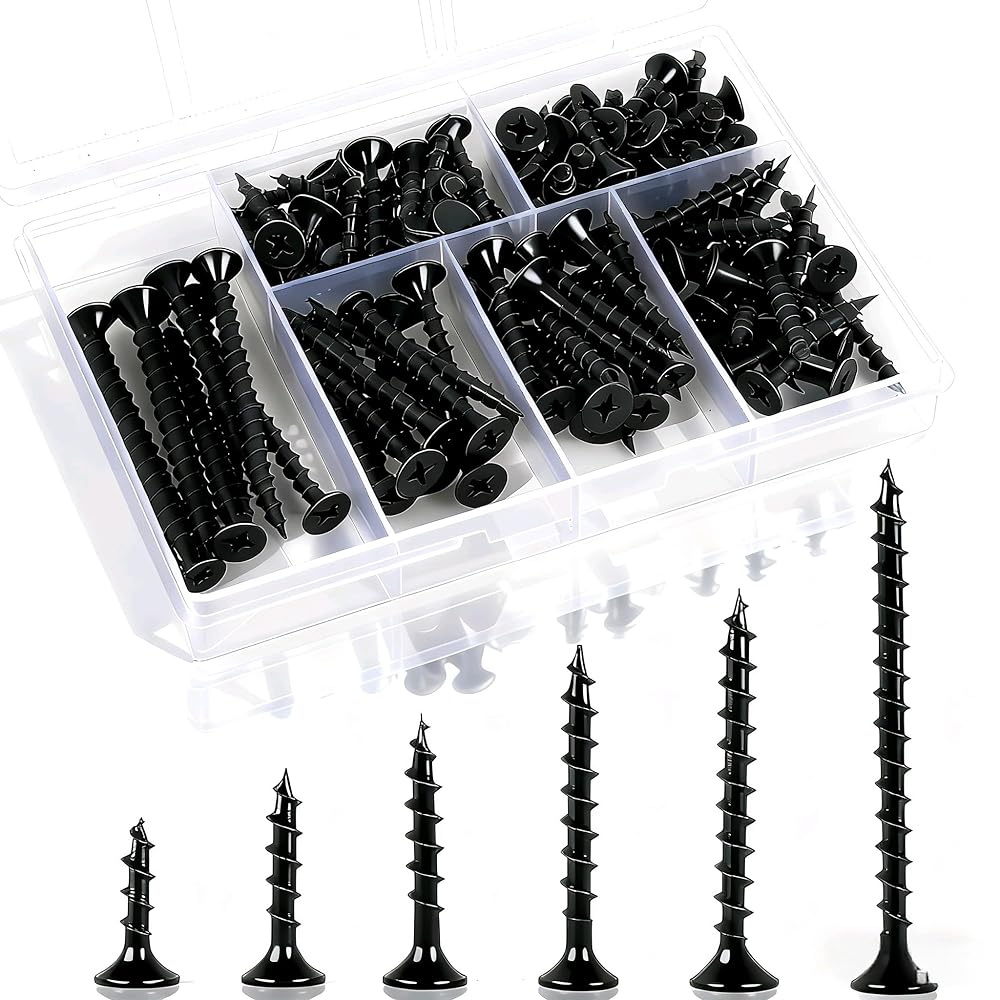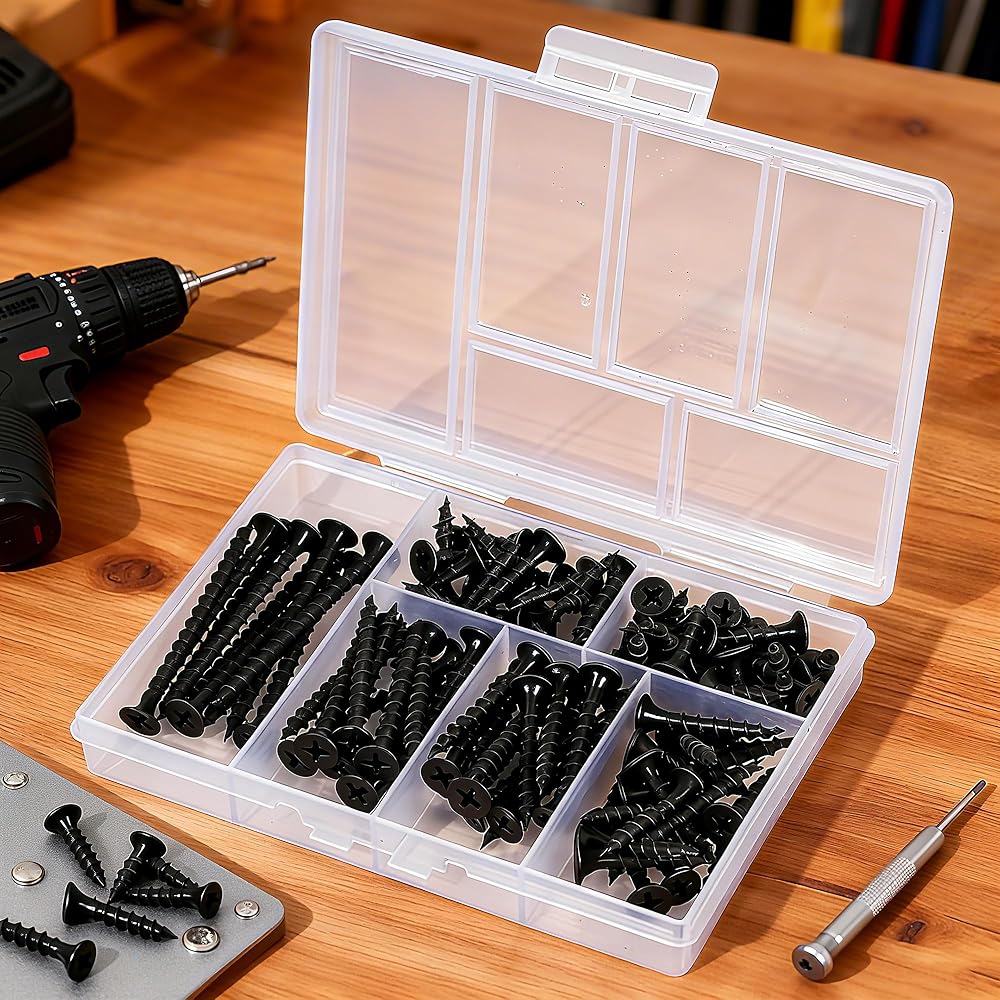 مجموعة متنوعة من البراغي الخشبية 105 قطعة، مجموعة براغي متنوعة للجدران الجافة عالية الصلابة، 6 مقاسات، محرك فيليبس، براغي سوداء صغيرة وطويلة للخشب (2 بوصة، 1-1/2 بوصة، 1-1/4 بوصة، 1 بوصة، 3/4 بوصة، 1/2 بوصة)
