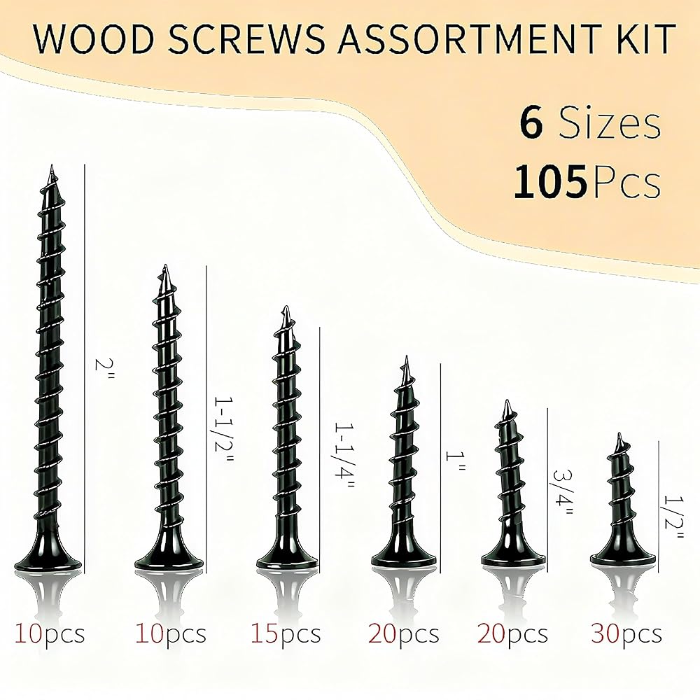 Various sizes: A kit of wood screws in 6 sizes (#6 x 2 in, #6 x 1-1/2 in, #6 x 1-1/4 in, #6 x 1 in, #6 x 3/4 in, #6 x 1/2 in), a total of 105pcs for diverse projects.