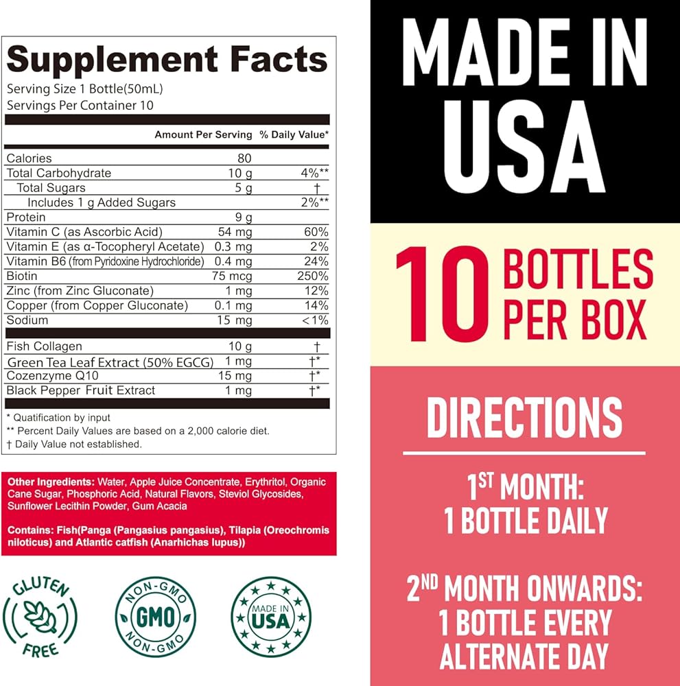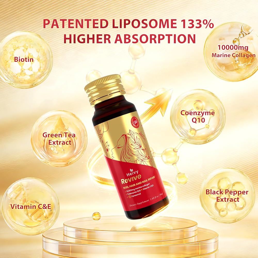 امتصاص أعلى بنسبة 133% من المنتجات الأخرى: يتميز بتكنولوجيا الليبوزوم الحاصلة على براءة اختراع لتعزيز التوافر البيولوجي بنسبة 133% (مصنوع باستخدام التكنولوجيا التي تغطيها براءة الاختراع الأمريكية رقم 11,497,728 B2 (تستخدم بموجب ترخيص). توفر كل جرعة 50 مل 10000 مجم من ببتيدات كولاجين الأسماك البحرية تحت 1000 دالتون لامتصاص الأمعاء المباشر، أكثر فعالية من الكولاجين السائل الشائع أو مسحوق الكولاجين أو الحبوب أو الكبسولات.