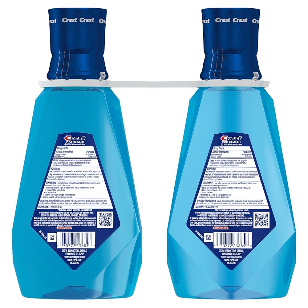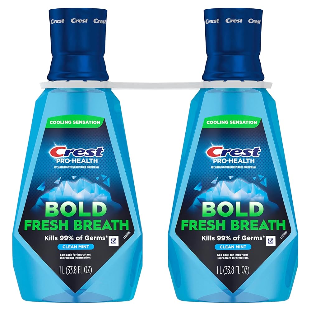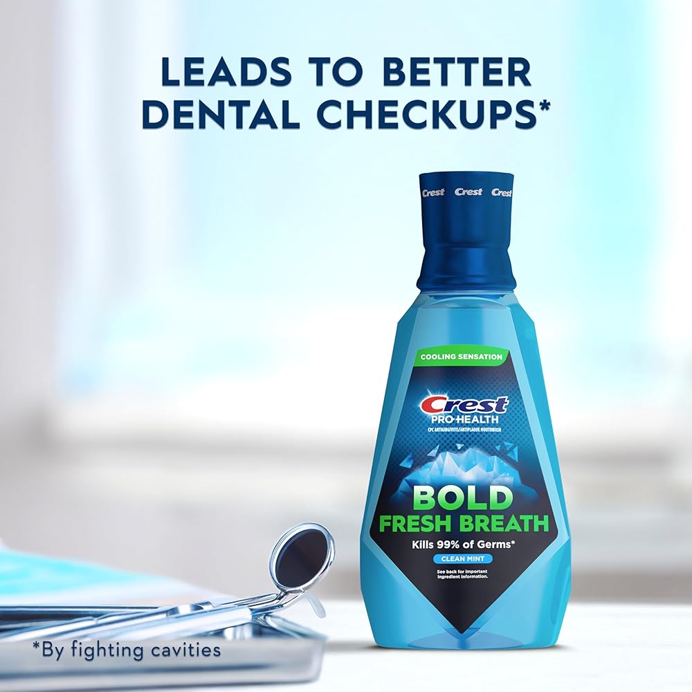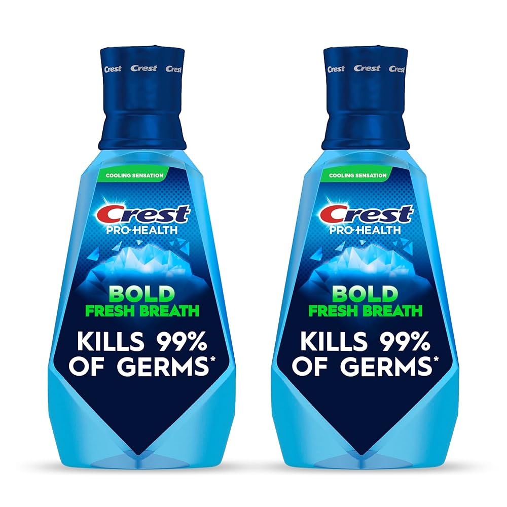 Bring on long-lasting freshness with every rinse. Crest Pro-Health Bold Fresh mouthwash kills 99% of germs* helping you keep your teeth cleaner for longer.**It powerfully fights plaque buildup and supports gum health over time. Experience an intense cooling sensation paired with a clean mint flavor that leaves your mouth feeling invigorated and refreshed without a harsh medicinal taste. Whether you're starting your day or winding down in the evening, this rinse is a perfect way to freshen breath and maintain your oral health. For best results, use twice daily, morning and night, swishing for 30 seconds each time. *that cause plaque, gingivitis, and bad breath **vs brushing alone
