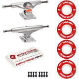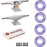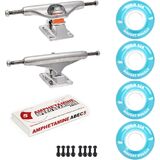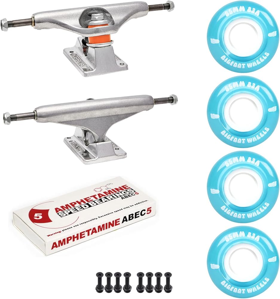 Set up your new deck or upgrade you current one with this Trucks/Wheel/Bearing/Hardware package! Included in this package is a set of 4 83A Bigfoot Cruiser Skateboard wheels. The all-new Bigfoot Cruisers offer a smooth rolling, 83A urethane on a typical street-sized skateboard wheel. Fast and quiet, these are ideal for riding the roughest spots. Filmers love these wheels! A high-rebound formula makes these wheels fast and smooth. The hard plastic core allows for precision bearing alignment which keeps these wheels rolling fast (soft wheels without a core put restrictive pressure on bearings during turns which slows you down). At 32mm wide, we pretty much took a normal street wheel and scaled the durometer down to 83A. Also included is a set of Independent trucks in a variety or sizes. Durable, high performance truck for all types of skateboarding. 356 T6 Aluminum hanger and baseplate, solid Chromoly steel axle, grade 8 kingpin, Supercush cushions with cylinder bottom. Featuring superior turn and stability, better grind clearance, improved no hang-up yoke for grind tricks, and less wheel bite. They last longer and are stronger on impact than any other truck on the market. Independent trucks are Made In The USA. To finish out the package we include a set of Amphetamine Abec 5 bearings and 1" hardware.