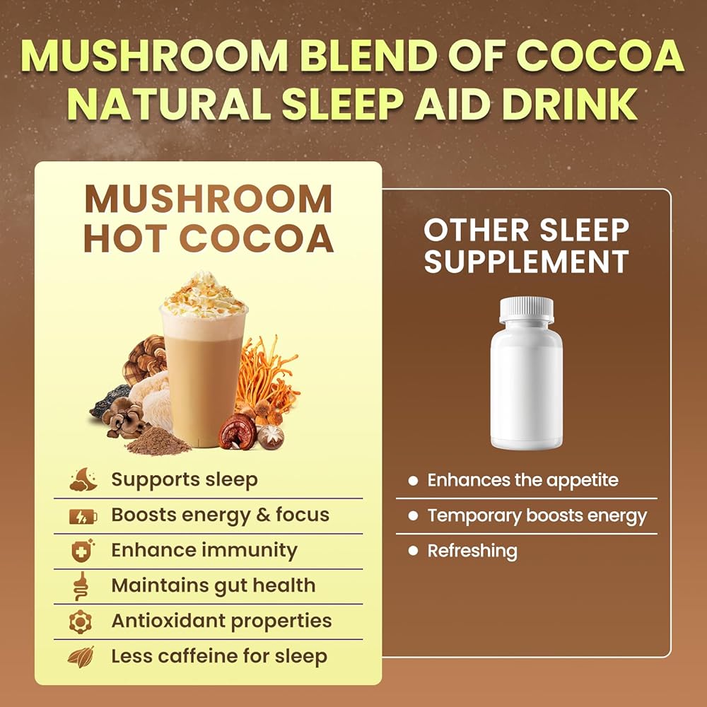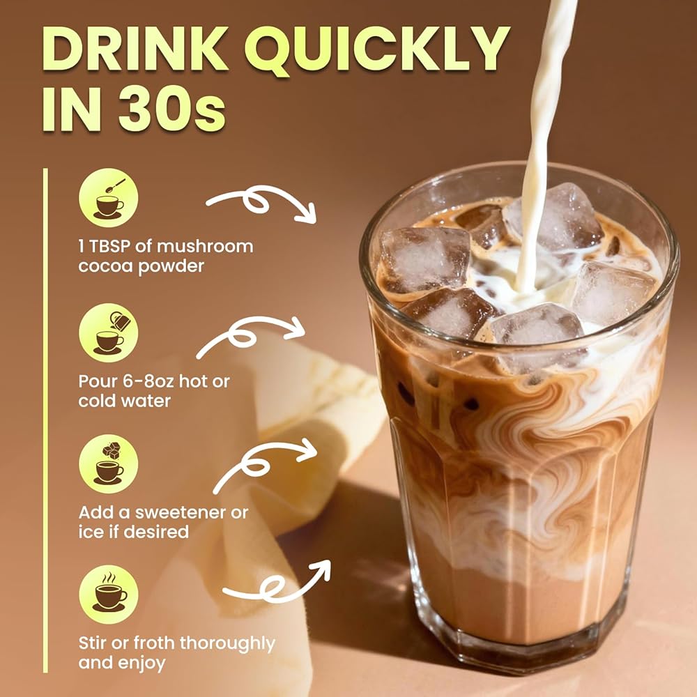 ادعم نومك ليلاً - يجمع مسحوق الكاكاو الساخن بالفطر بين مكون دعم النوم ومركب الفطر المتميز والفريد من نوعه. ما عليك سوى خلط ملعقة واحدة مع الماء الساخن أو الحليب لتناول مشروب مريح قبل النوم، للمساعدة في تعزيز الاسترخاء والاستعداد للراحة.