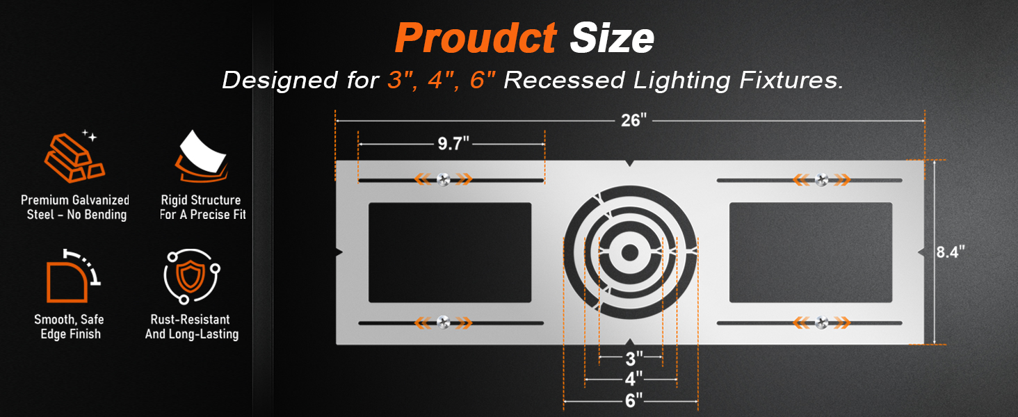 هيكل معدني عالي التحمل: مصنوعة من الفولاذ المجلفن عالي الجودة، ألواح التثبيت هذه مقاومة للانحناء والتشوه. أقواس موثوقة لتركيبات الإضاءة المريحة طويلة الأمد في البيئات السكنية والتجارية.