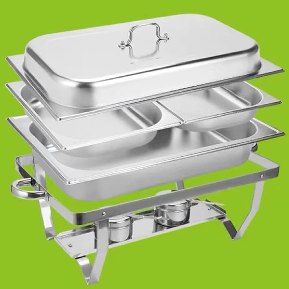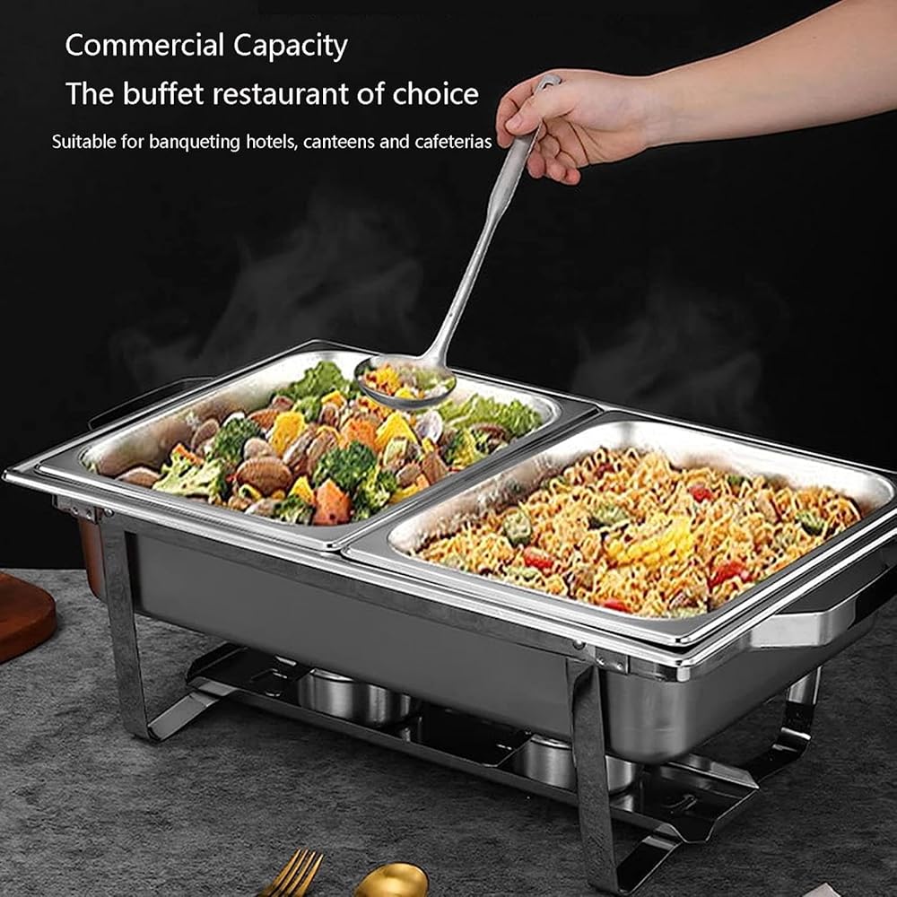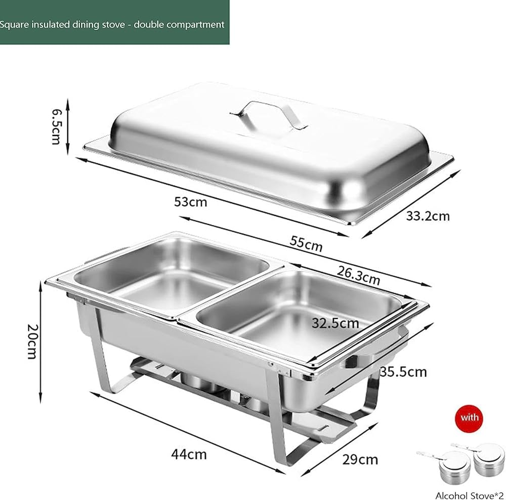 طبق ساخن للبوفيه من الفولاذ المقاوم للصدأ - يحتوي على صينية تسخين من الفولاذ المقاوم للصدأ، مجموعة بوفيه وعاء ساخن، سخان طعام مع غطاء من الفولاذ الصلب وحامل لتقديم الطعام في حفلات الزفاف (حجرة مزدوجة/ج)