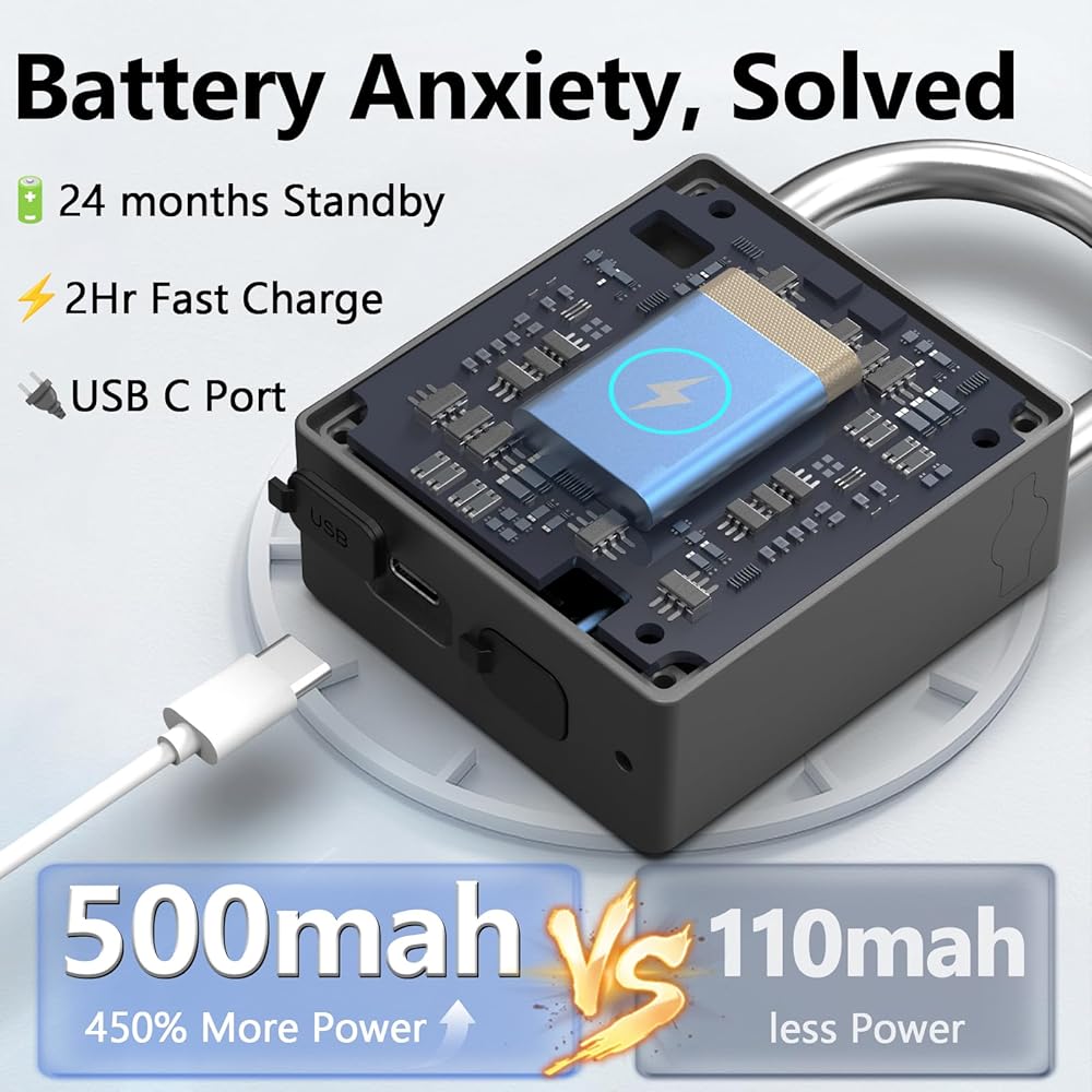 🔋365 يومًا من الطاقة، بدون قلق: انسَ الشحن المتكرر. توفر البطارية بسعة 500 مللي أمبير في الساعة ما يصل إلى عام واحد من زمن الانتظار وتدعم 8000 عملية فتح بشحنة واحدة. يشتمل القفل على كابل من النوع C مجاني و4 مفاتيح احتياطية، بحيث تكون دائمًا محميًا - حتى لو نفدت البطارية.