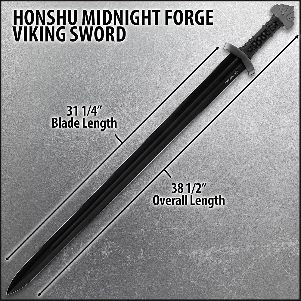 The Honshu Midnight Forge Viking Sword is a refined blend of ancient tradition and modern design. Measuring 38 1/2" overall, it features a 1060 carbon steel blade with a 4mm thickness—built to deliver lasting strength and performance. The sword's striking all-black finish lends a sleek, understated look, while the Viking-style hilt and pommel pay tribute to historical craftsmanship. The thermoplastic rubber handle offers a secure and comfortable grip, and a well-placed 5" point of balance supports smooth handling. The sword comes complete with a black semi-gloss wooden scabbard and a matching leather frog for versatile display or carry. Whether you're a collector, enthusiast, or admirer of functional artistry, the Honshu Midnight Forge Viking Sword makes a commanding addition to any collection.