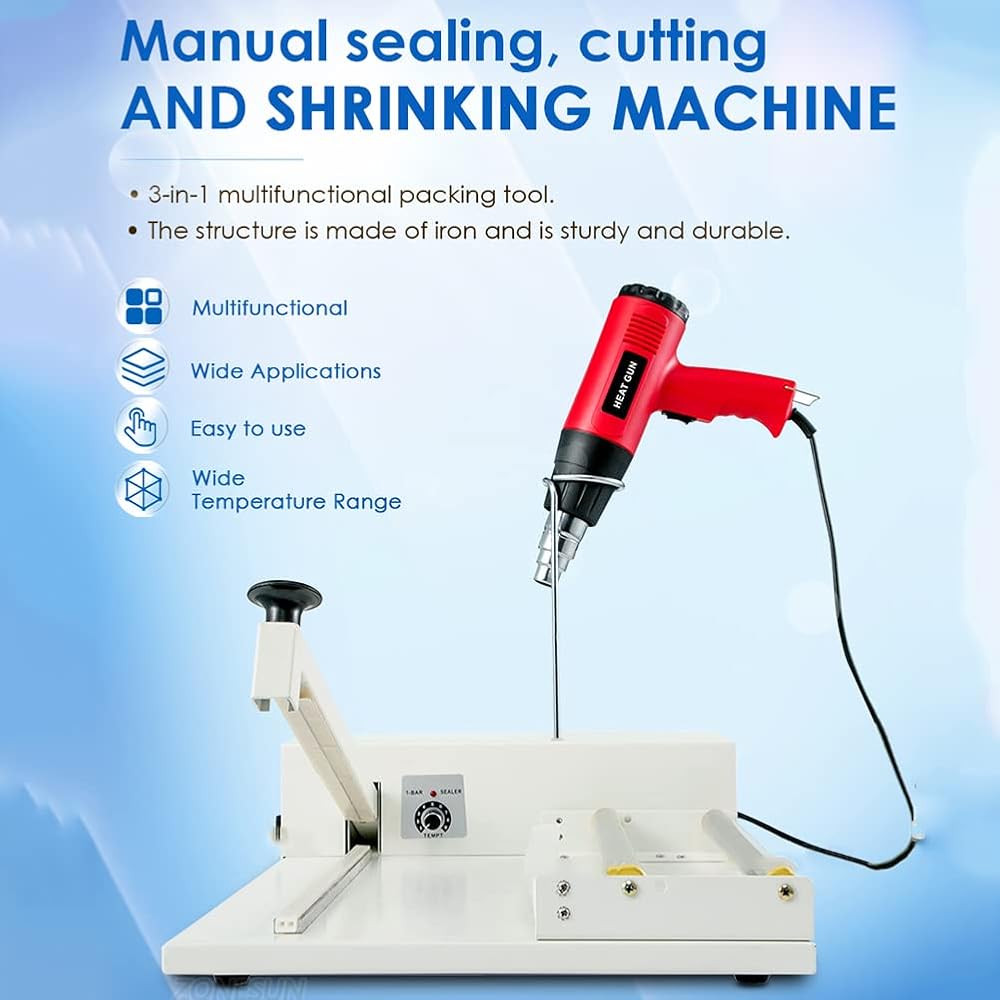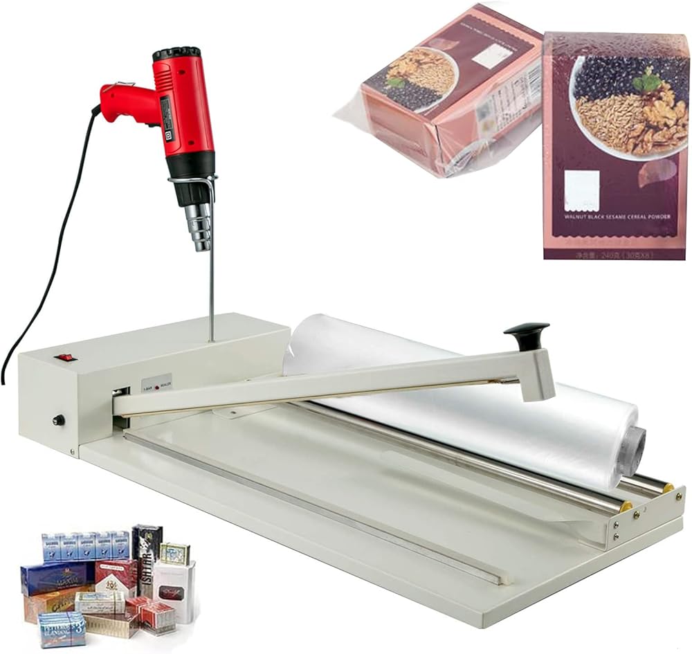 Easy Sealing: The packaging film slides smoothly on the rollers, and the silicone strip and lever mechanism make sealing easier; use the included heat gun for subsequent shrinking to achieve professional-grade sealing results.