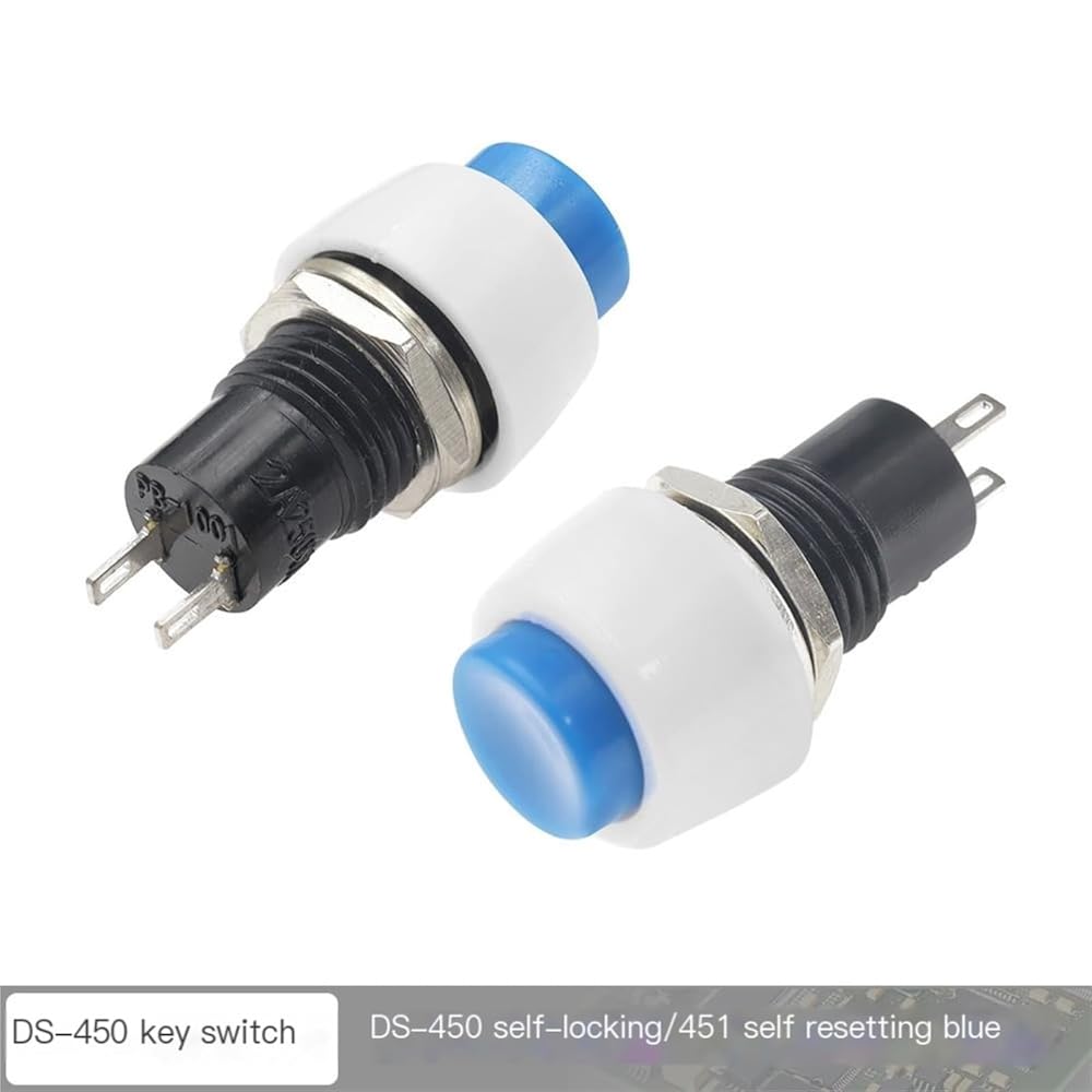 6 قطع مفتاح زر الضغط، DS-450 إعادة ضبط مفتاح زر صغير مستدير ذاتي القفل 250 فولت 2 أمبير دبوس نحاسي أحمر وأخضر 10 مم (أزرق)