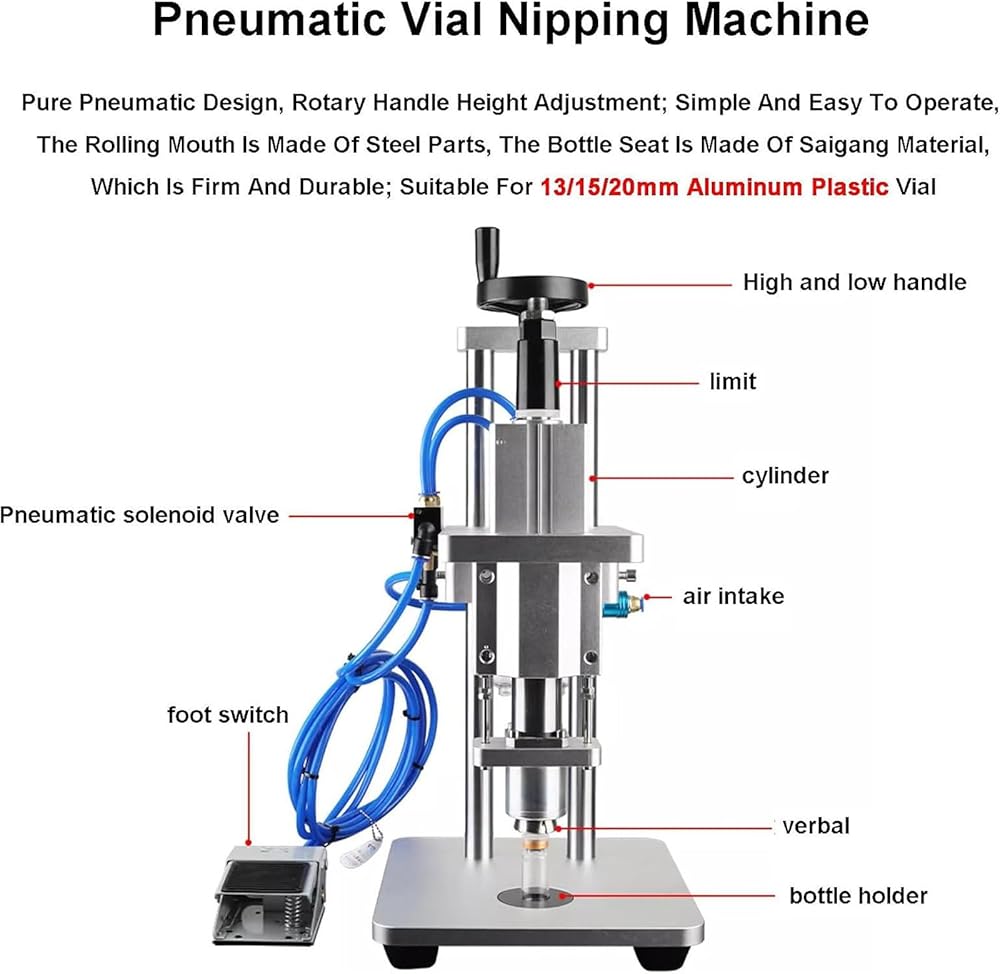 Versatile functionality: Designed for precision and safety, this industrial-grade vial capping machine supports 13/15/20mm aluminum-plastic vials with pure pneumatic control for reliable performance.