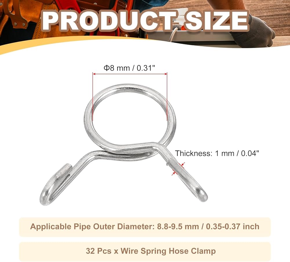 • Material: 304 Stainless Steel (18-8); Wire Diameter: 1 mm / 0.04 inch; Inner Diameter: 8 mm / 0.31 inch; Applicable Pipe Outer Diameter: 8.8-9.5 mm / 0.35-0.37 inch; Package List: 32 Pcs x Wire Spring Hose Clamp