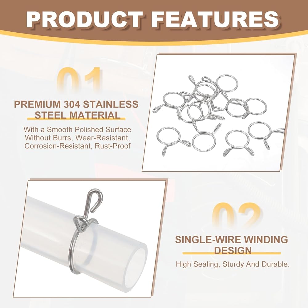 • Advantage: This small and precise spring pipe clamp is made of premium 304 stainless steel material, with a smooth polished surface without burrs, wear-resistant, corrosion-resistant, rust-proof, double-wire winding design, high sealing, sturdy and durable