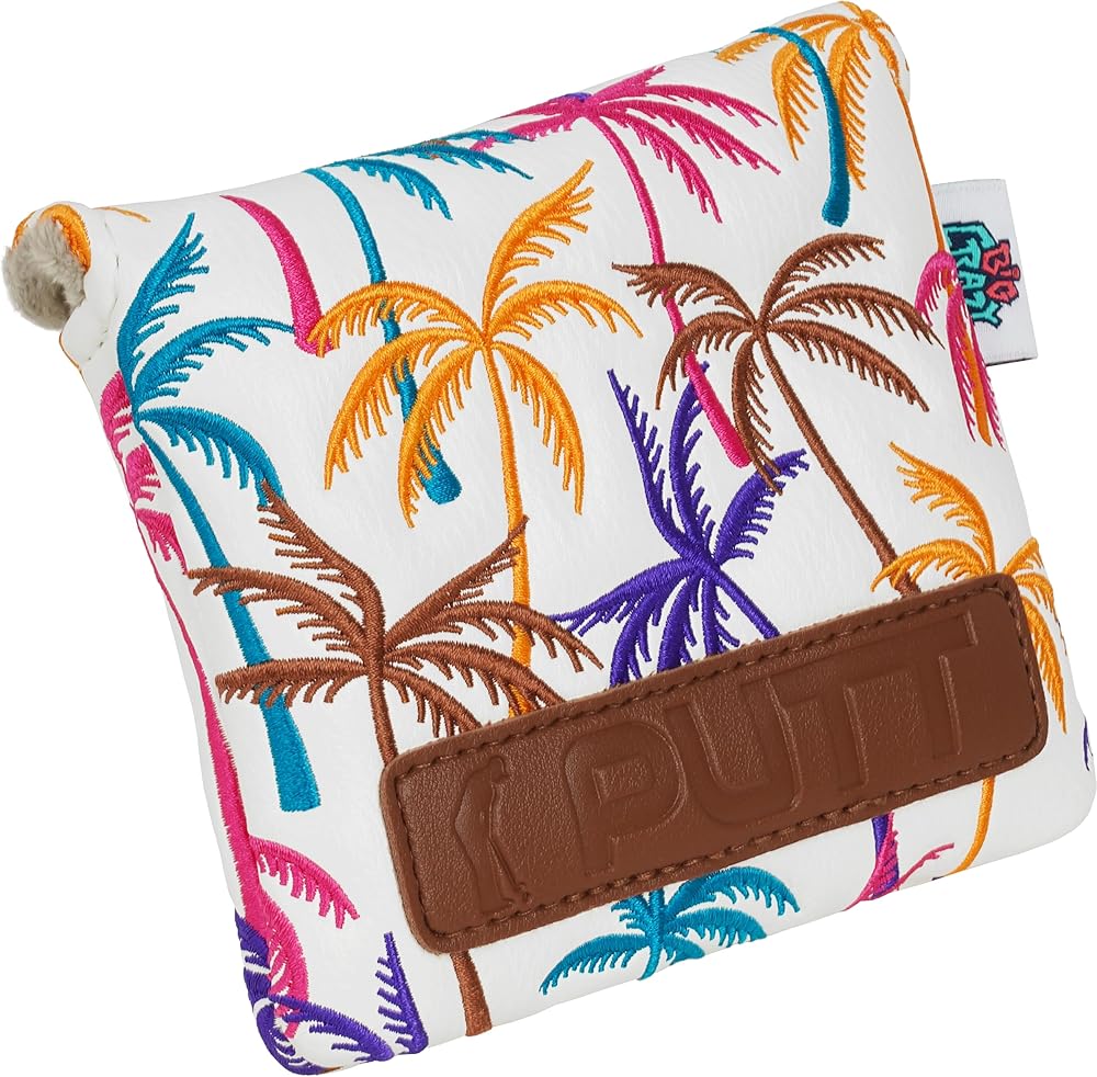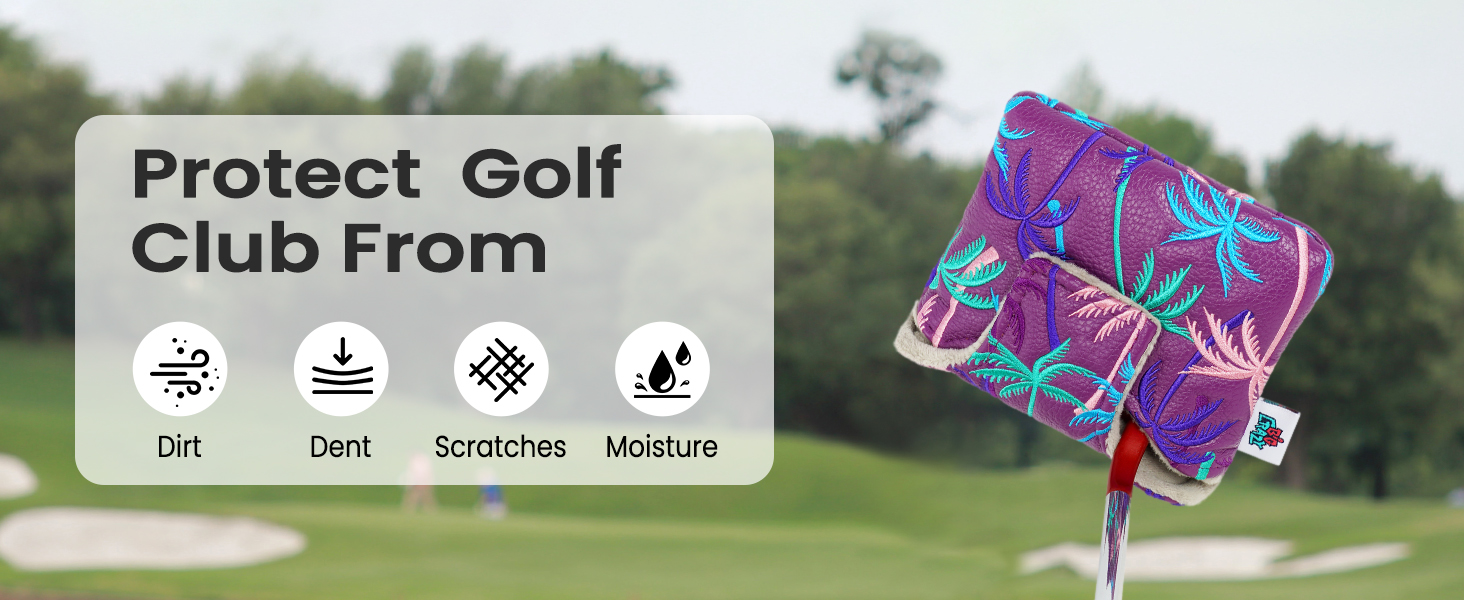 • يتميز بتصميم رائع لتطريز شجرة جوز الهند، وهو متوفر باللونين الأرجواني والأبيض. غطاء رأس مضرب المطرقة هو ملحق جولف لطيف للاعبي الجولف.