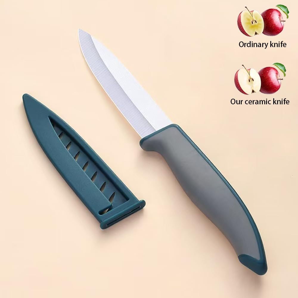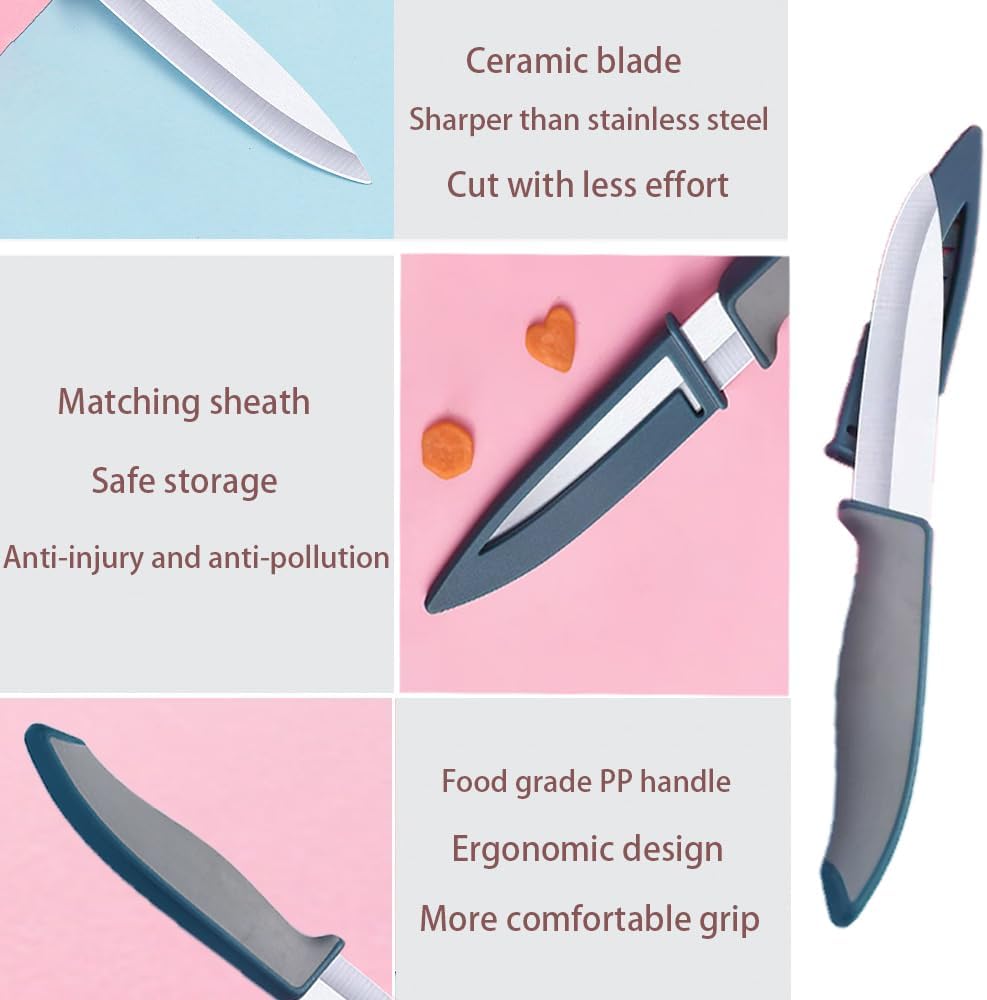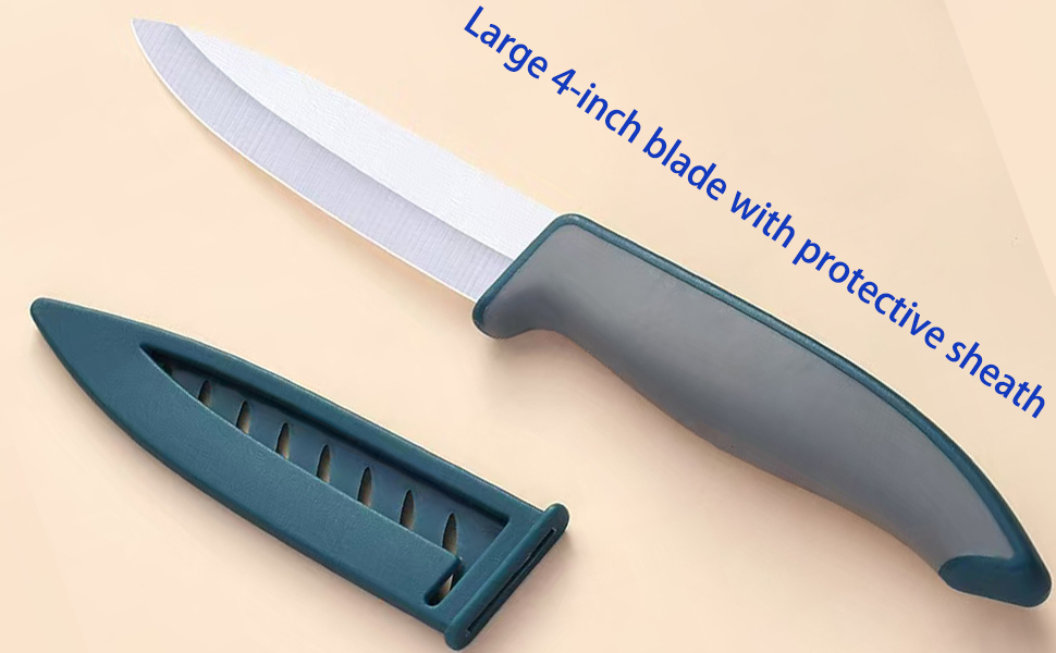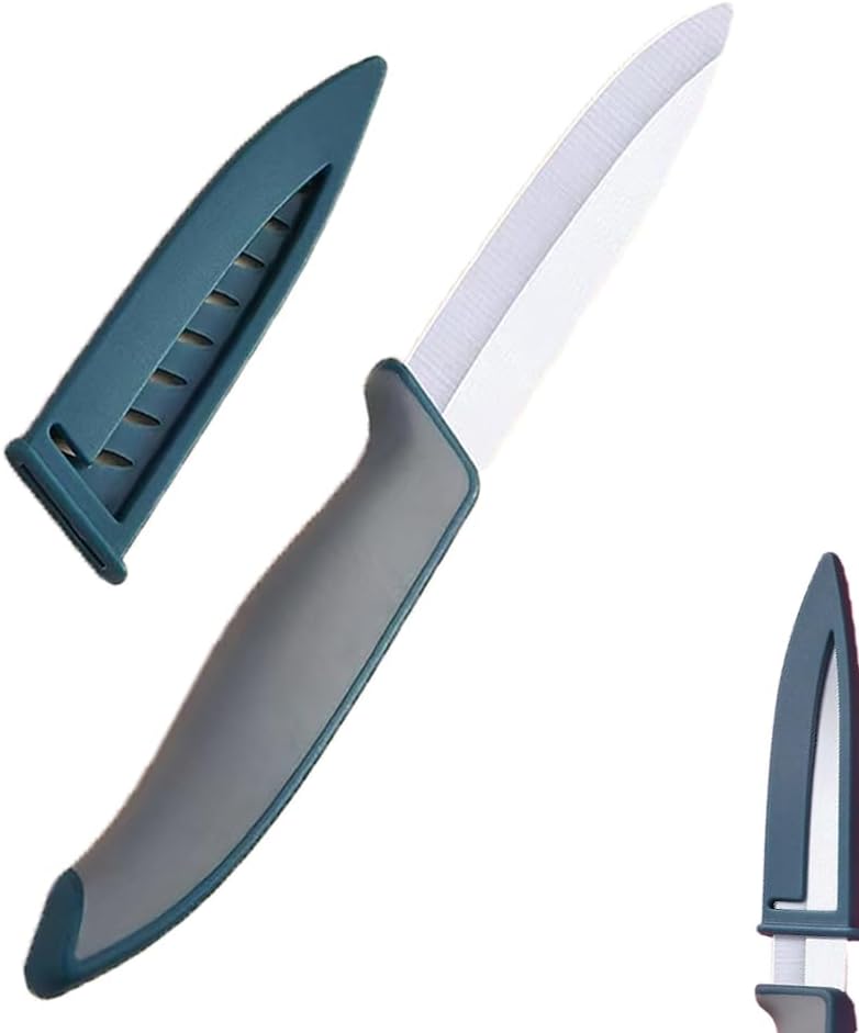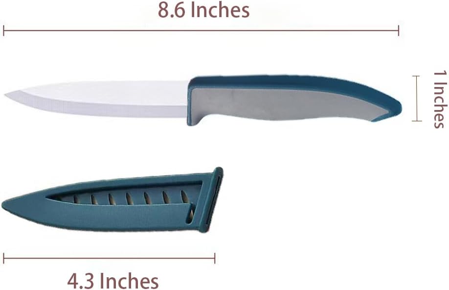 مجموعة السكاكين: سكين الفاكهة السيراميكي ذو تصميم ثنائي اللون باللون الأزرق والرمادي، وشفرة سيراميك الزركونيا 4 بوصات وتأتي مع غمد واقٍ.