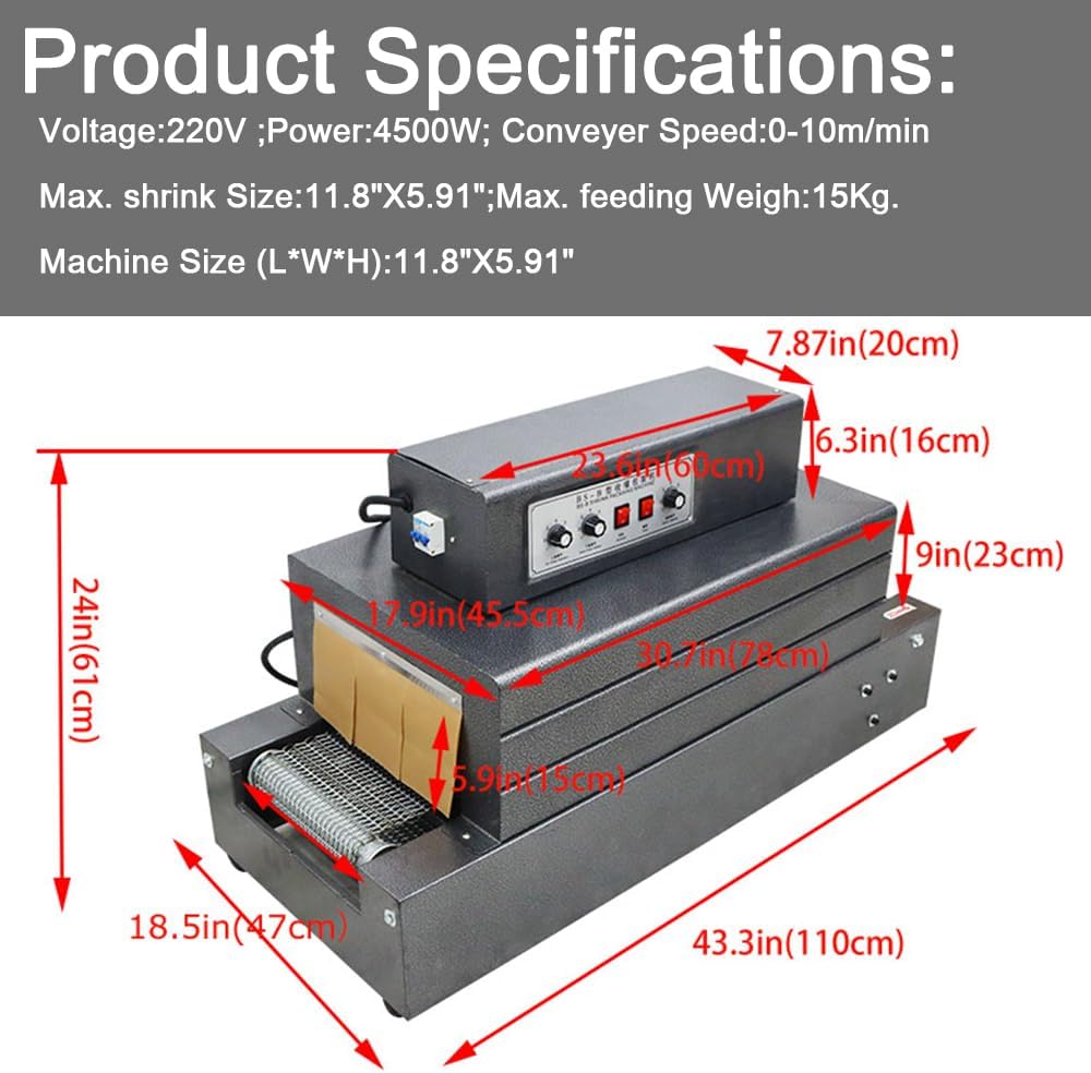 • 【المعلمة: الجهد الكهربي: 220 فولت، الطاقة: 4500 وات؛ سرعة الناقل: 0-32.8/قدم (0-10 م/دقيقة)؛ الحد الأقصى لحجم الانكماش: 11.8 بوصة × 5.91 بوصة (30 × 15 سم)؛ الحد الأقصى لوزن التغذية: 15 كجم (33 رطل)؛ حجم الماكينة: 43.3 × 18.5 × 24 بوصة.