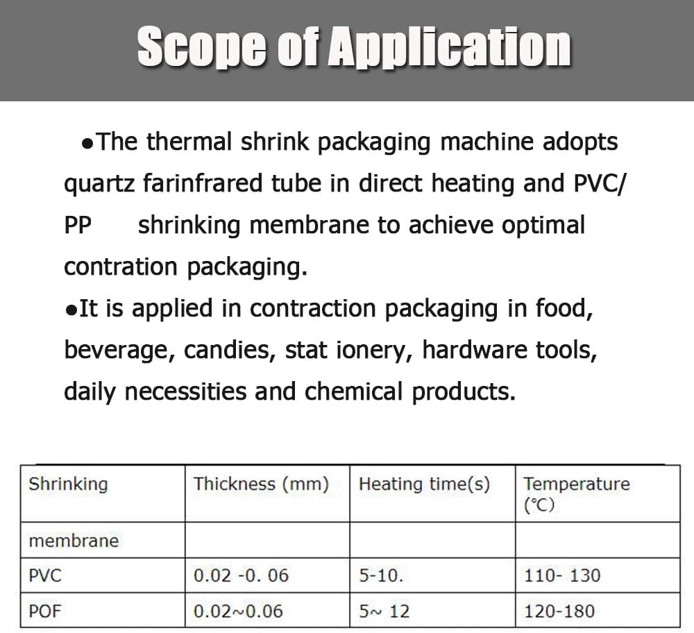 • [مبدأ العمل] تعتمد آلة التغليف بالانكماش الحراري أنبوب الكوارتز بالأشعة تحت الحمراء البعيدة في التسخين المباشر وغشاء الانكماش PVC/PP/PE لتحقيق التعبئة والتغليف الانكماش الأمثل.