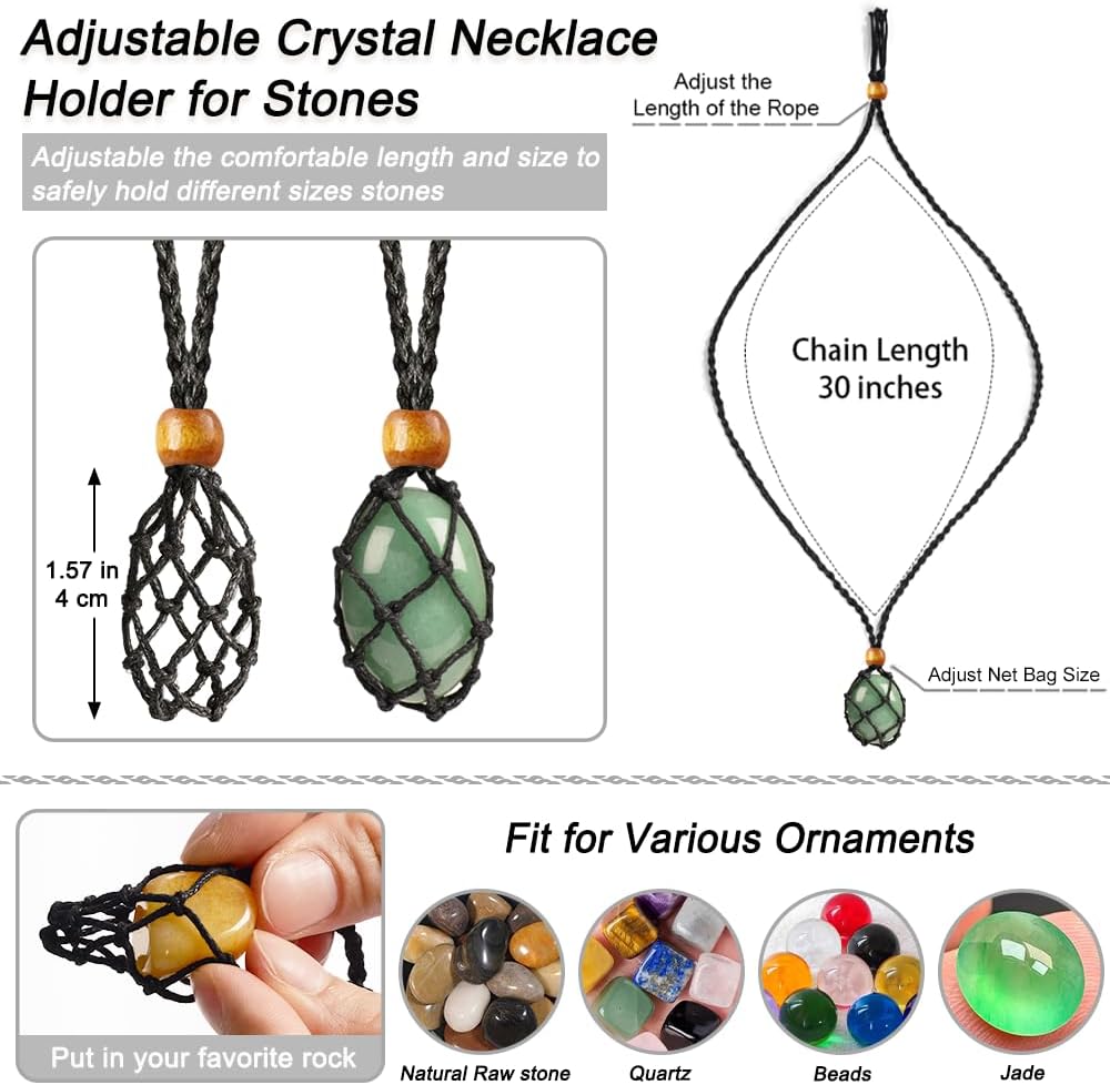 • Adjustable Crystal Necklace Holder with Wooden Beads - Each of the 6 adjustable crystal necklaces features a handmade wax cord with a secure cage design and two sliding wooden beads. Each empty stone holder is about 4 cm/ 1.57 inch long, can safely hold your ornaments and crystals. This allows you to easily customize the length and safely hold different sized stones, offering versatile and stylish wear for any occasion.