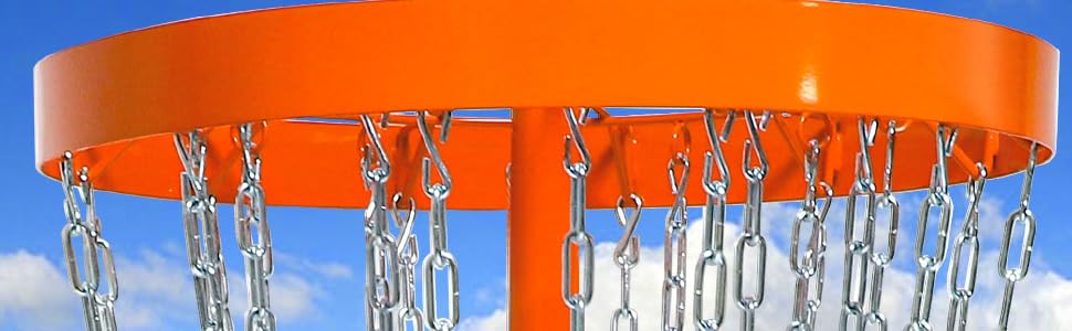 【Anti-rust & Heavy-duty】This disc golf basket is constructed of powder-coated steel frame and zinc galvanized chains, and the center solid support poles measured 1.6”, this Disc Golf Practice Basket with excellent rust and weather resistance can withstand harsh environments, suitable for outdoor practice.