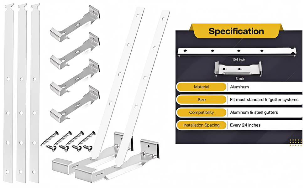 【أشرطة دعم ممتدة مقاس 10.6 بوصة】يتميز هذا الطراز بحزام ألومنيوم أطول مقاس 10.6 بوصة، ويوفر وصولاً أعمق للتركيب الآمن على سطح السقف. يعد هذا الطول الممتد ضروريًا لاستيعاب المظهر الجانبي الأكبر للمزاريب مقاس 6 بوصات على هياكل السقف الخالية من الحواف.
