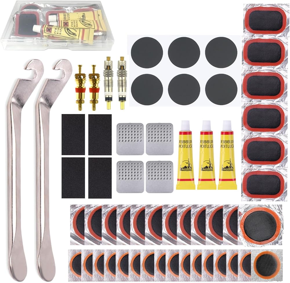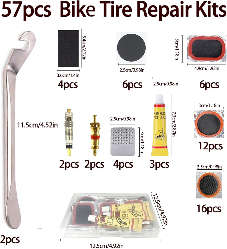 The Ciomszan All-in-One Bike Tire Repair Kit is a comprehensive emergency solution for flat tires, ideal for outdoor cycling. It includes 34 multi-size patches (16 small round/1.18inch, 12 large round/1.47inch, 6 rectangular), 10 pre-applied glueless patches, 2 metal tire levers, 4 stainless steel rasps, 4 pieces of sandpaper, 4 scraping tools, 4 tubes of glue, 2 Presta valve cores, and 2 Schrader valve cores. All accessories are neatly packed in a high-strength portable storage box, weighing only 2.8oz for easy carrying.