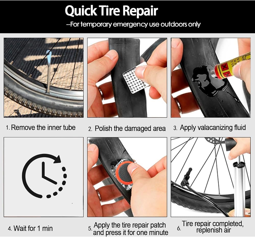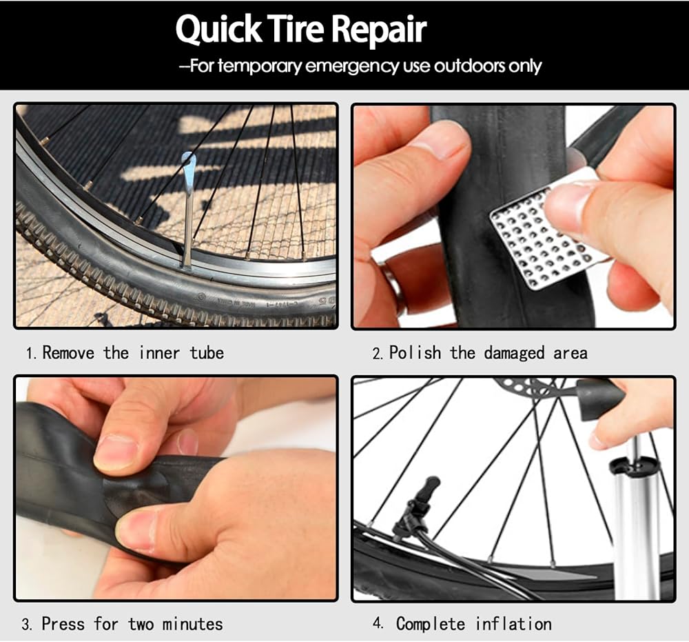 【Fast & Safe Emergency Repair】The kit includes 10 pre-applied glueless patches – perfect for fixing tire punctures quickly when riding in the wild, mountain roads, or highways. Just follow the step-by-step diagram, and you can repair leaks easily to get back to happy outdoor cycling in no time.