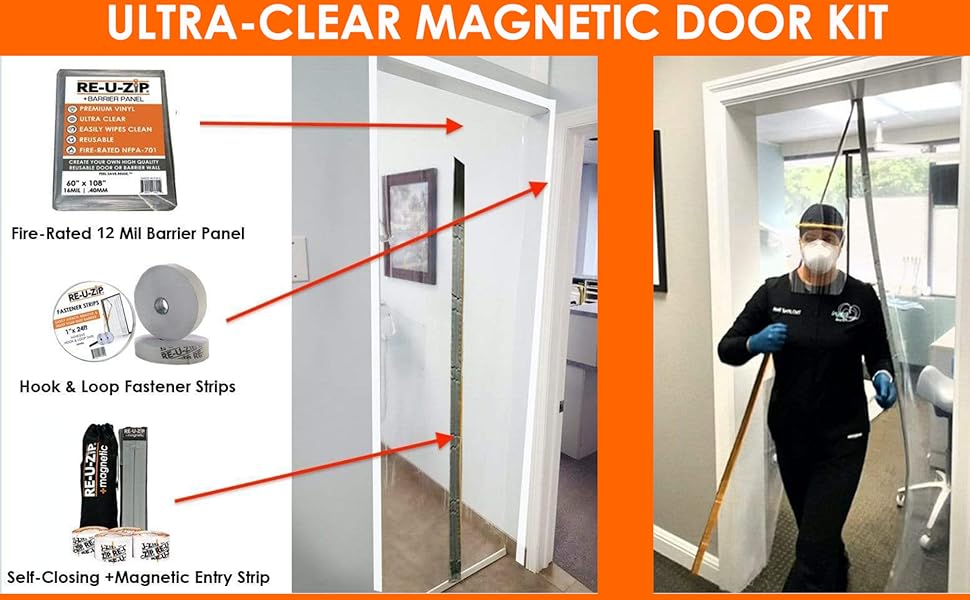 RE-U-ZIP® طقم باب شريط الدخول المغناطيسي فائق الوضوح ذاتي الإغلاق | مقاومة للهواء السلبي وموثوق بها في غرف الأبحاث والبناء وإعادة التصميم | فينيل FR قياسي 6 مل (3.4 × 7.2 قدم)