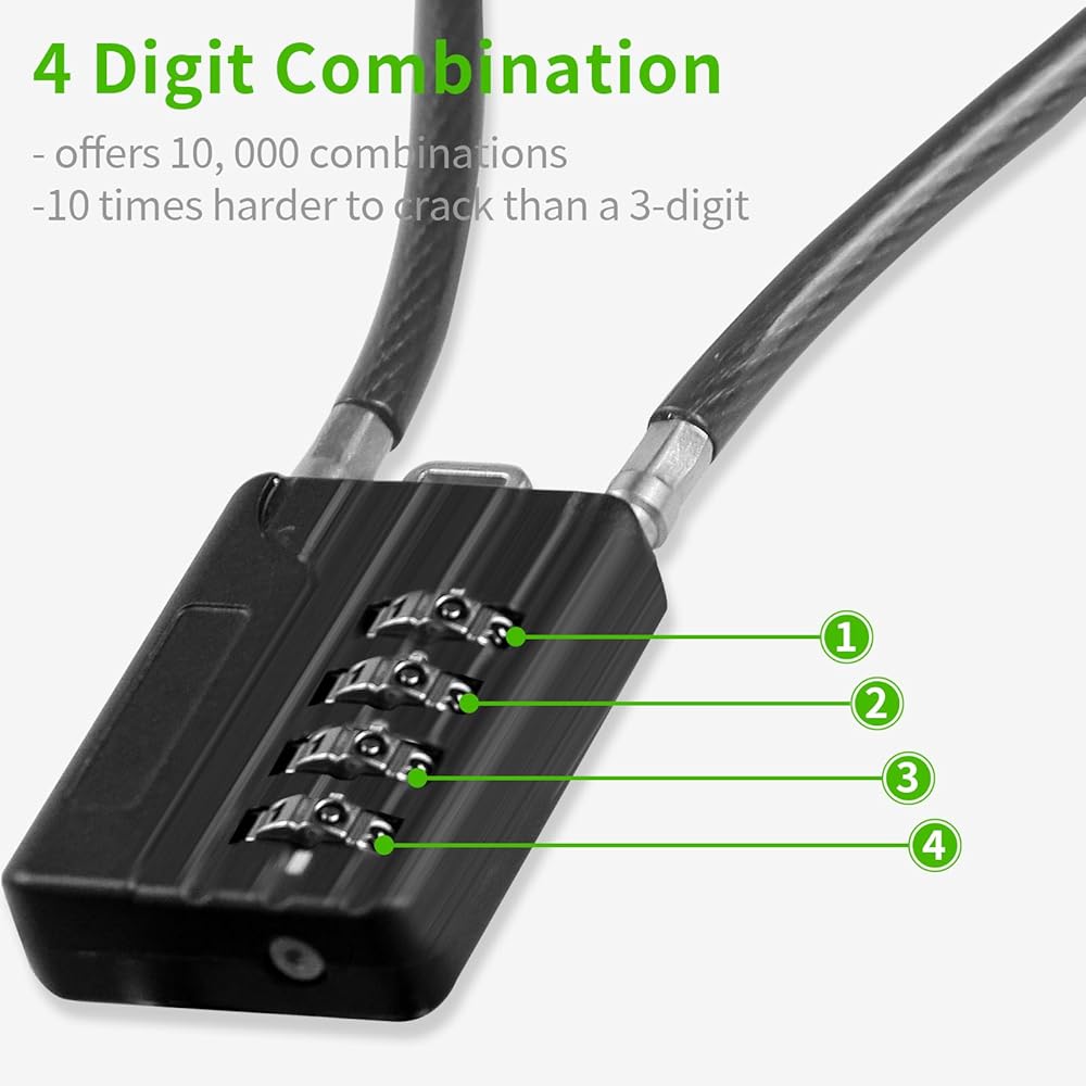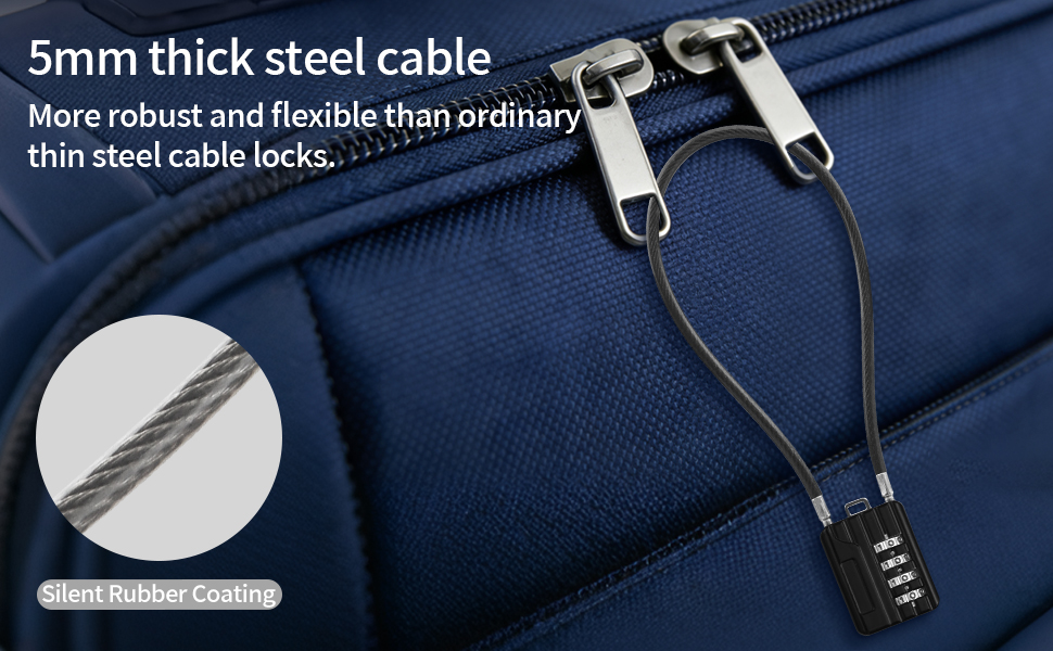 1. كابل فولاذي أقوى وأكثر مرونة مصمم بكابل فولاذي بسمك 3 مم ينحني بسهولة حول المقابض والمزالج مع مقاومة القطع والتمدد والتآكل اليومي. مثالي للسفر وصالة الألعاب الرياضية والمنزل والاستخدام الخارجي.