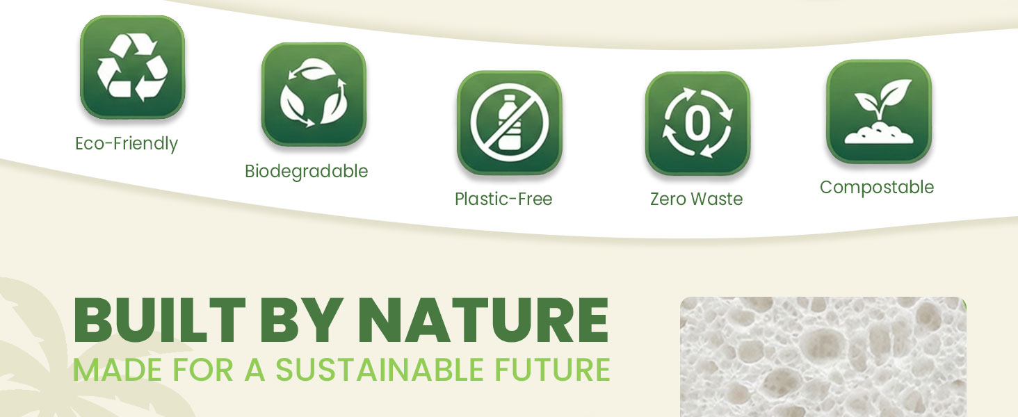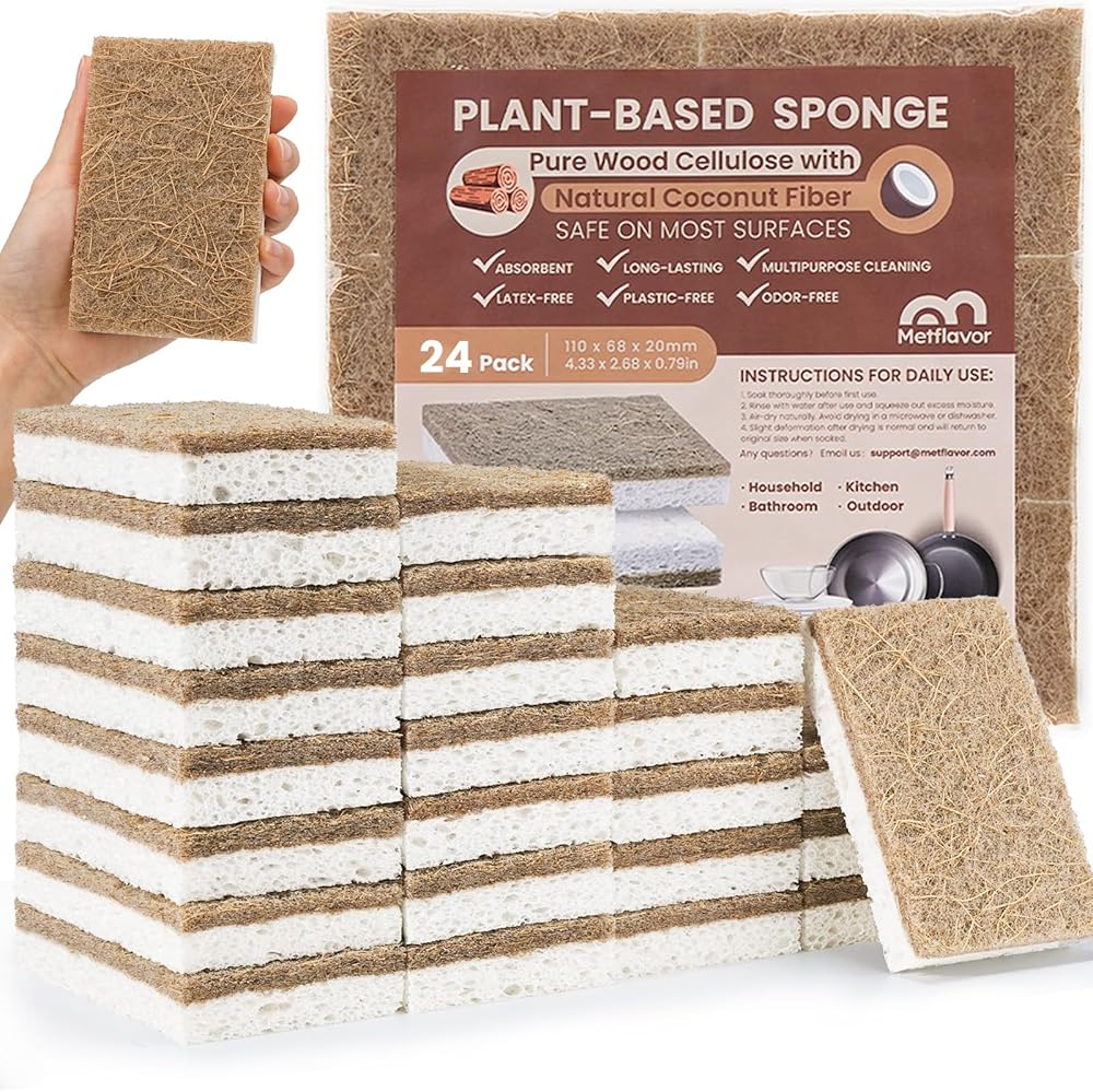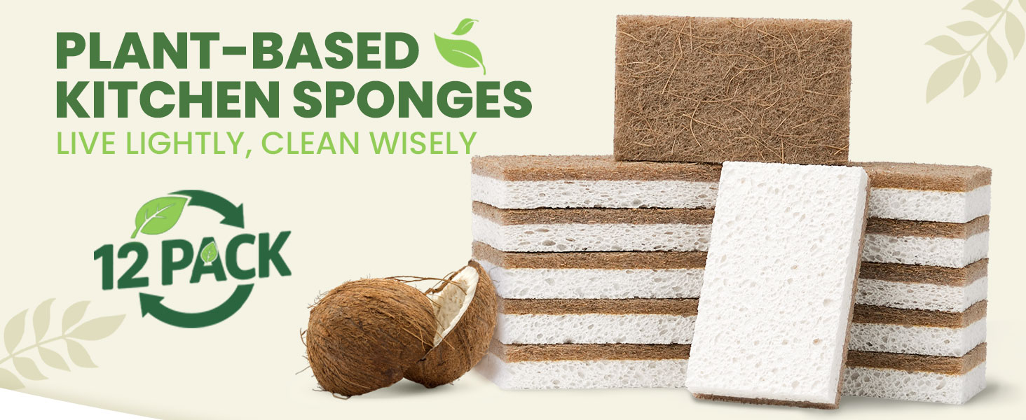 🍃 نباتي وطبيعي - مصنوعة من السليلوز الطبيعي المعتمد من مجلس رعاية الغابات (FSC) ومزيج من ألياف جوز الهند للتنظيف، تعمل إسفنجتنا على رفع الأوساخ دون عناء دون ترك أثر. مثالية لكل شيء بدءًا من الأواني الزجاجية الرقيقة والمقالي غير اللاصقة وحتى القدور شديدة التحمل التي تحتوي على الأطعمة المخبوزة