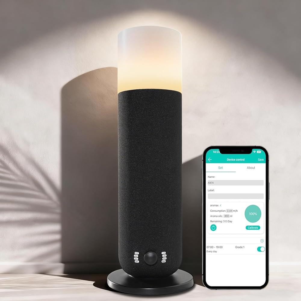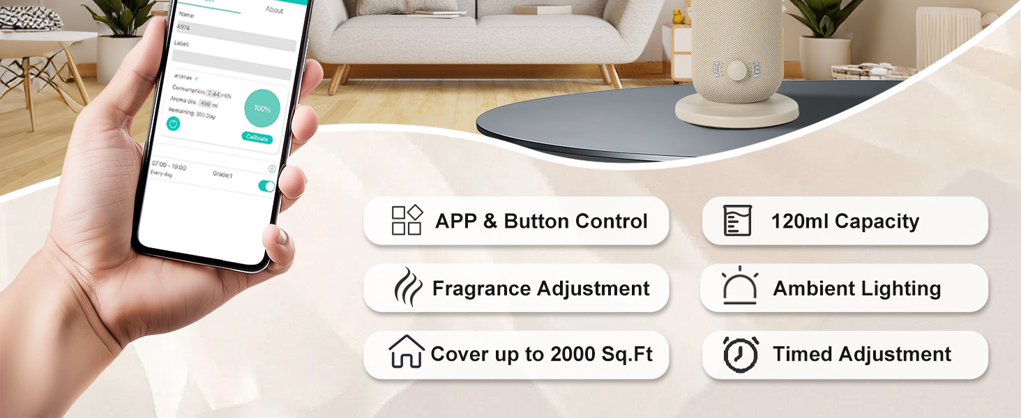 【التحكم في التطبيق والزر】يحتوي موزع الزيوت العطرية على طريقتين للتحكم. يتطلب ذراع التحكم في التطبيق تنزيل تسويق الرائحة، يمكنك ضبط الإضاءة، التشغيل/الإيقاف، التوقيت، إخراج الرذاذ كل ساعة، استهلاك الزيت العطري، تقدير وقت الاستخدام، يحتاج إلى ضمان مسافة 30 قدمًا، كافية للاستخدام في غرفة كبيرة؛ إذا كنت لا ترغب في تنزيل برنامج أو استخدام موزع الروائح لكبار السن، يمكن للموزع بدون ماء استخدام الزر. التحكم، توقيت 1/3/6H، 3 تعديلات متدرجة، التحكم في الإضاءة المحيطة لإضفاء الراحة على حياتك.