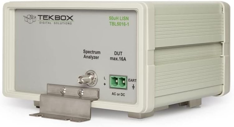 TekBox TBL5016-1 50uH 16A Line Impedance Stabilisation Network LISN The TBL5016-1 50µH LISN is a device required to setup conducted noise measurements of DC or AC-powered electronic equipment. It is designed according to CISPR 16-1-2 and MIL-STD-461F standard and characterized in the frequency range of 9kHz to 100 MHz. Apart from carrying out conducted noise measurements, LISNs are also used to establish a defined impedance for various other standardized tests. The LISN is a 50O/50µH+5 O single line design with a high current jumper to short the 5 Ohm resistor and configure it as 50O/50µH LISN according to CISPR 16-1-2. The LISN is characterized up to 100 MHz which means that the LISN can be used for the combined range of 9 kHz to 100 MHz. The LISN is inserted into the supply line of the DUT (Device Under Test). Conducted noise, which is present at the supply terminals of the DUT can be measured at the BNC connector using a spectrum analyzer or a measurement receiver. The source (supply) terminal and the DUT terminal are decoupled by a 50µH inductor. DC or single phase measurements typically require a pair of TBL5016-1. Combining it with the Tekbox LISN Mate enables separate measurement of common mode and differential mode noise. DUTs with 3 phase supply require three or four pieces of TBL0516-1, depending on whether the product is supplied in delta or star configuration. The unit comes equipped with a BNC-male to N-male RG232 cable, mating connectors, high current configuration jumpers and ground brackets to attach it to a ground plane.