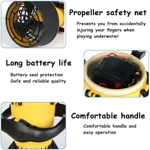 Experience the freedom of underwater exploration with our Underwater Sea Scooter, designed for divers looking to enhance their time beneath the waves. Say goodbye to the limitations of air supply and cumbersome towing equipment. This electric scooter is crafted to minimize energy expenditure, allowing you to effortlessly glide through the water and discover new underwater destinations. **Specifications:** - **Name:** Underwater Sea Scooter - **Battery:** 6AH Lead-Acid, 24V - **Charging Time:** 4-5 hours - **Runtime:** Approximately 40 minutes to 1 hour, depending on speed - **Power:** 300W/500W - **Maximum Speed:** 3.2 mph - **Maximum Depth:** 30 meters - **Water Seal:** Three-stage seal for optimal waterproofing With a compact battery size of 15 x 10 x 9.5 cm, the scooter is designed for convenience. It offers a discharge rate of 20 hours, ensuring you can make the most of your underwater adventures without worrying about power. **What's Included:** - 1x Sea Scooter - 1x 24V 6AH Lead-Acid Battery **User Instructions:** 1. After entering the water, grip the operating handle securely with both hands. 2. Adjust the machine's height by pressing the tail with your elbows, keeping it slightly lower than the head. 3. Position the tail against your chest, securing it with a swimming ring. 4. Press and hold the start switch with your right hand to activate the propeller. 5. As the scooter propels you forward, slowly raise your legs behind you. 6. Enjoy a smooth ride through the water, perfectly synchronized with your movement. 7. To stop, simply release the start switch. Whether you're diving or swimming, this underwater scooter transforms your aquatic experience, making it more enjoyable and adventurous. Dive deeper, swim longer, and explore the wonders of the underwater world with ease.