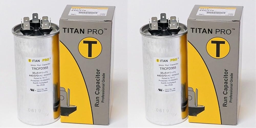 2 PACK TitanPro TRCFD355 HVAC Round Dual Motor Run Capacitor. 35/5 MFD/UF440/370 Volts Specifications: Diameter- 2.11" Height- 4.13" Add 1/2 inch to height for terminal length. Round in shape. There are 1/4" male terminals on the capacitor. Rated at 35/5 MFD/uf 440/370 Volts 50/60HZ. Features: Heat tolerant, tested up to 60,000 hours of run time. Cans are made of high-grade metallized polypropylene film and proprietary Epoxidized Soybean Oil (ESO). Three tri-blade terminals (c, h, f) Rated to 158 Degrees (Fahrenheit), Protected to 10,000 AFC. Meets UL 810 safety standards. NON PCB Long Life Operation.