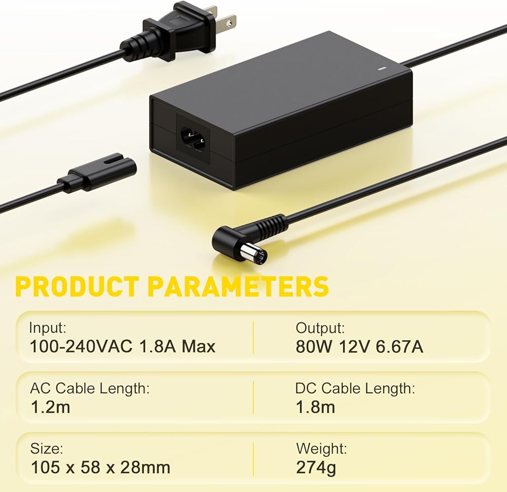 المواصفات: الإدخال: 100-240 فولت تيار متردد 50 ~ 60 هرتز 1.8 أمبير كحد أقصى؛ الإخراج: 80 واط 12 فولت 6.67 أمبير ؛ طول كابل تيار مستمر: 1.8 متر؛ طول كابل التيار المتردد: 1.2 متر؛ حجم الموصل: 7.4*5.0 مللي متر. انتبه: سلك الطاقة هذا غير متوافق مع قابس 5.5*2.5 ملم. متوافق مع سلك طاقة دريم ستيشن.