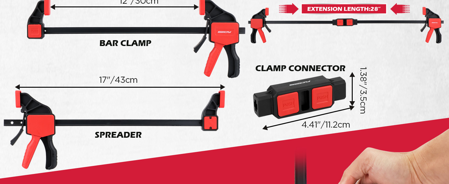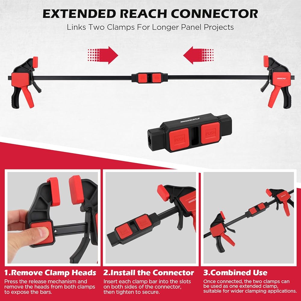 موصل المشبك - يتضمن موصل يربط مشبكين من طرف إلى طرف، ويمتد الوصول من 12 بوصة إلى أكثر من 24 بوصة. مثالية لربط الألواح والإطارات والأرفف ومجموعات الأعمال الخشبية الأكبر حجمًا