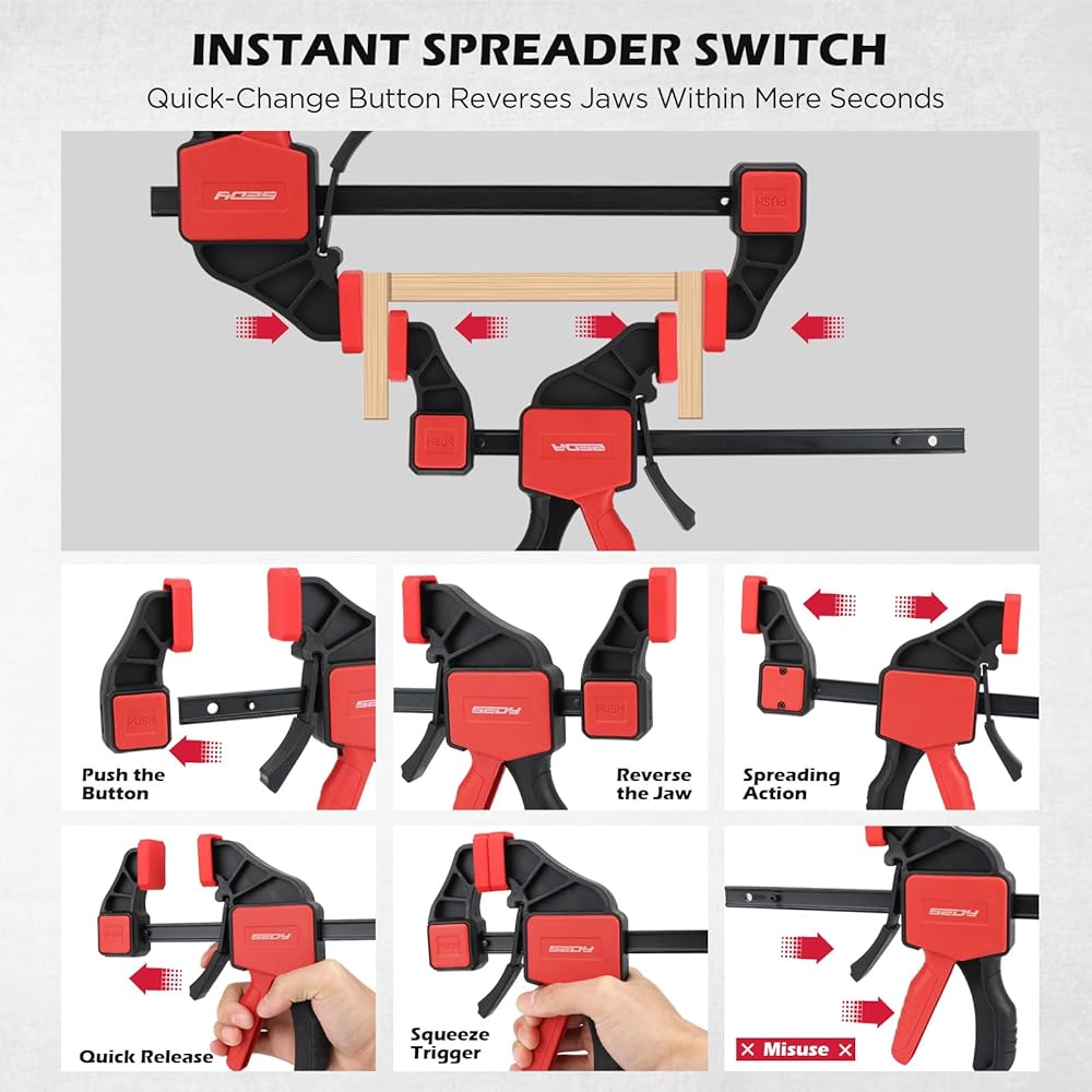 تغيير سريع - زر التغيير السريع الأحمر يسمح بإزالة الفك وعكسه على الفور، وتحويل المشبك إلى موزع في ثوانٍ. مثالية لأعمال الخزانة، وفصل اللوحات، والاستخدام متعدد الاستخدامات في ورشة العمل