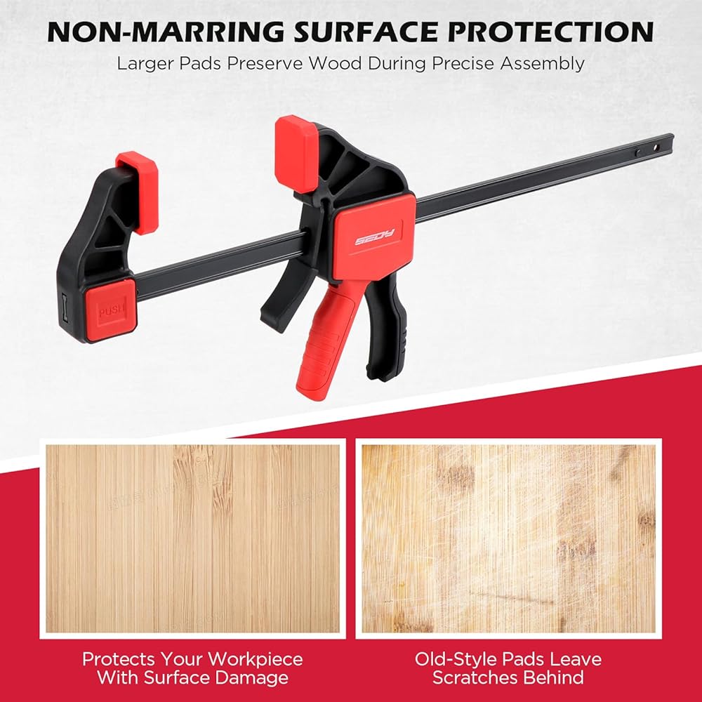 وسادات غير قابلة للتشوه - تعمل وسادات الفك الناعمة غير القابلة للتشوه على حماية الأسطح الخشبية مع الحفاظ على الضغط المتوازي. مثالية لعمليات الصمغ وأعمال التشذيب والتجميع ومهام الأعمال الخشبية الخفيفة