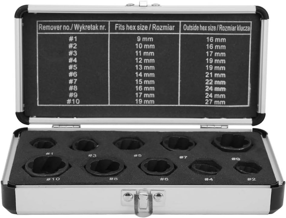 مجموعة أدوات استخراج البراغي شديدة التحمل مكونة من 10 قطع، مجموعة مزيل صامولة من الفولاذ الأسود مع علبة من الألومنيوم لإصلاح السيارات وصيانة الآلات، مفتاح ربط سداسي متري متوافق