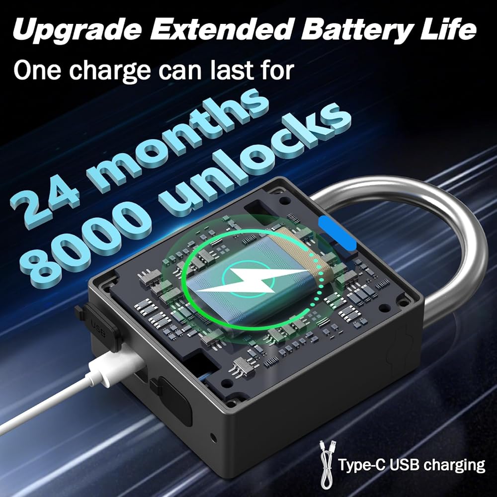 🔓 【عمر البطارية 24 شهرًا】 بطارية 500 مللي أمبير تدوم حتى 24 شهرًا / 8,000 عملية فتح بشحنة واحدة. إعادة شحن USB-C، سريعة ومريحة. تنبيه انخفاض مستوى البطارية حتى لا تتفاجأ أبدًا.