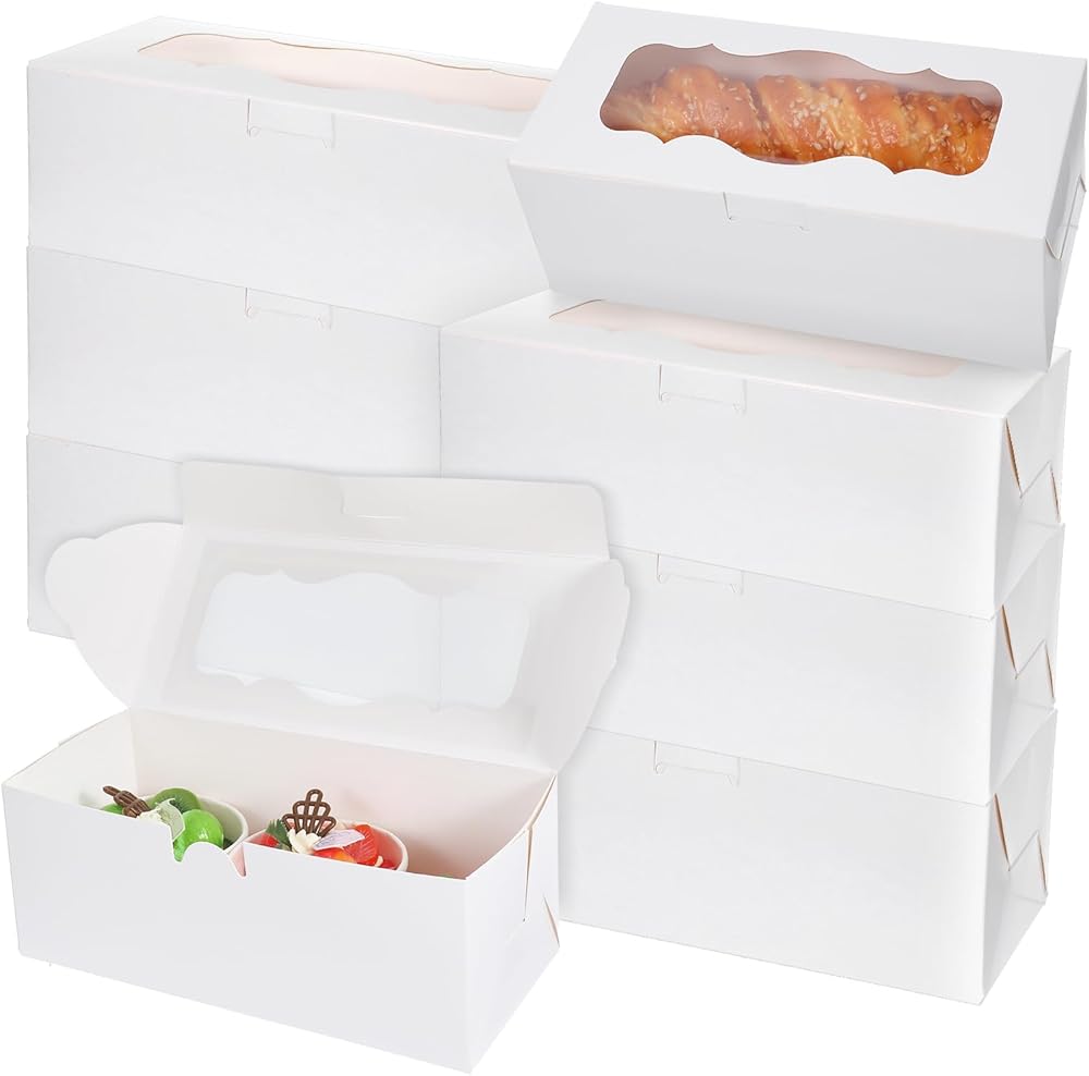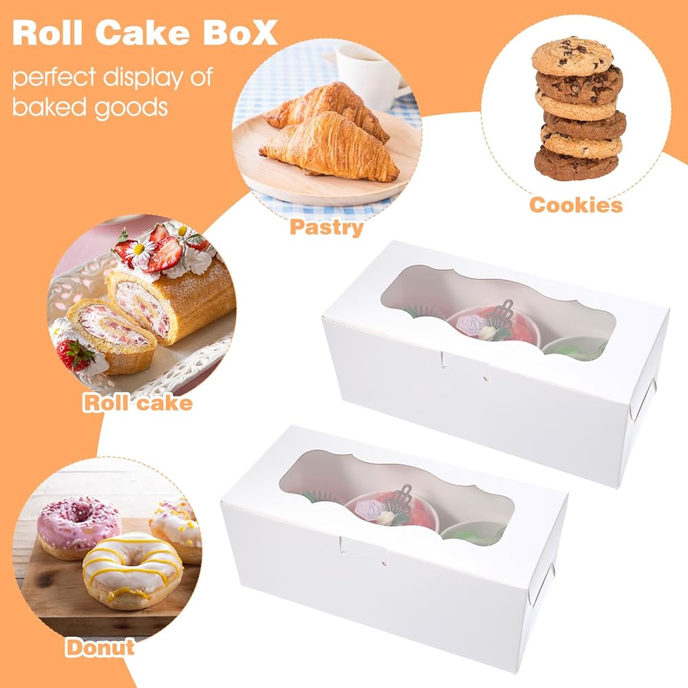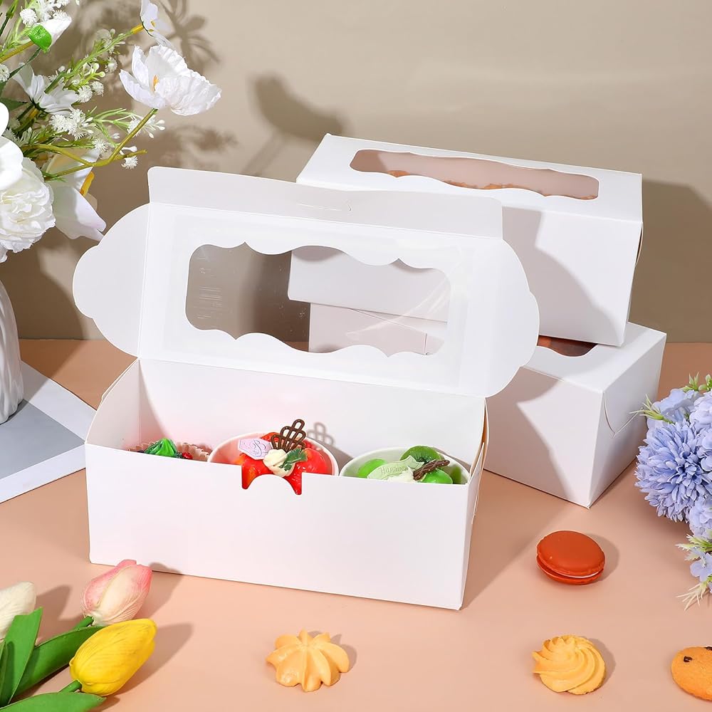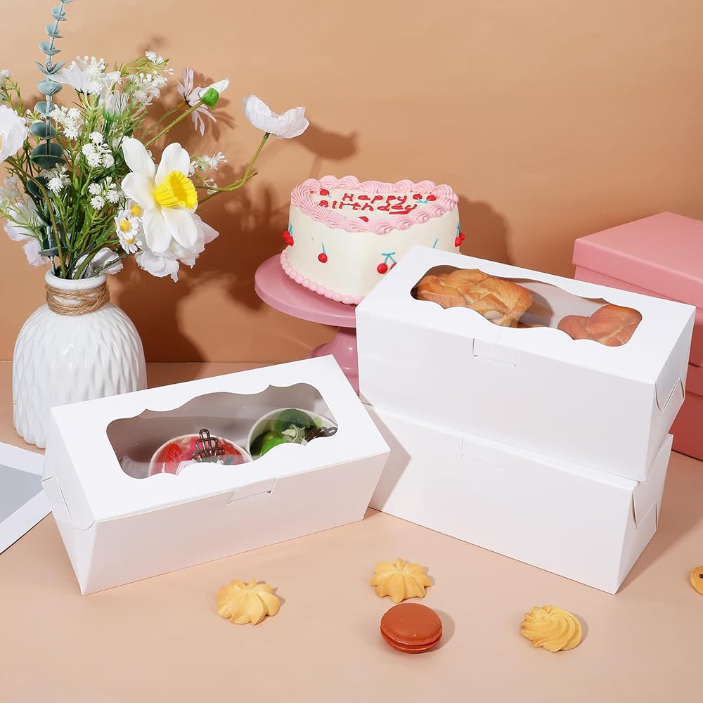 These white bakery boxes with windows are designed for both functionality and elegance, making them an excellent choice for packaging and displaying your baked goods. Crafted from durable, cardboard and featuring a clear window, these cookie boxes ensure your treats remain fresh while showcasing their visual appeal. Ideal for a variety of desserts, from roll cakes to muffins, they are perfect for retail, gifting, or special occasions.