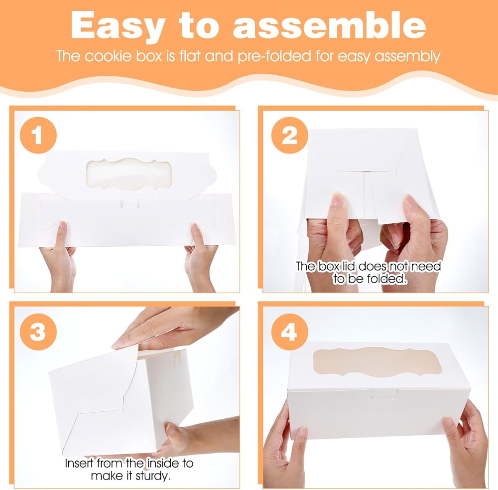 【Size and Material】These 9x4x3.5 Inch white bakery boxes are crafted from high-quality, food-grade cardboard, ensuring durability and safety for your treats. The clear window showcases your baked goods while maintaining freshness. The sturdy construction with thickened cardboard provides reliable support, making these cookie boxes ideal for transporting delicate desserts like macarons, muffins, and pastries without damage.