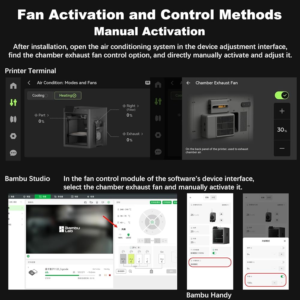 Seamless P2S Integration: Fully compatible with Bambu Studio/Bambu Handy/; once installed, the fan integrates into the P2S airflow control system with manual G-code or automated exhaust functions