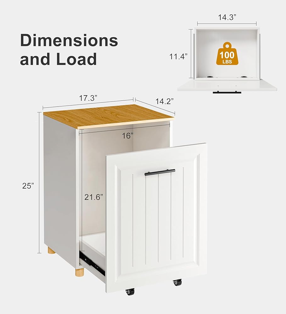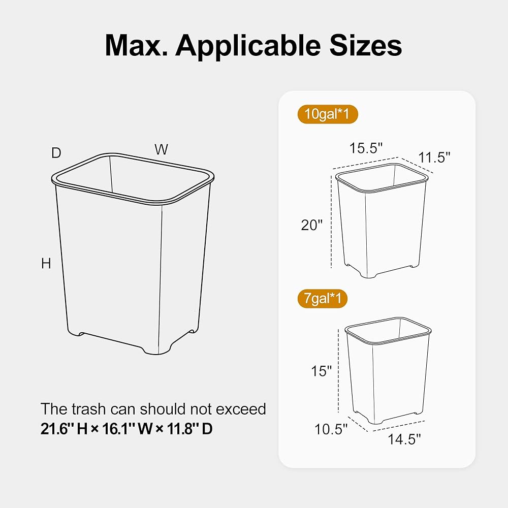 [دليل المقاسات قبل الشراء]: الحجم الإجمالي: 17.3 بوصة طول × 14.2 بوصة عرض × 25 بوصة ارتفاع. يتسع إما لسلة سعة 10 جالون أو 7 جالون. يرجى قياس سلة المهملات قبل الشراء لضمان الملاءمة المناسبة. (سلال المهملات غير متضمنة).
