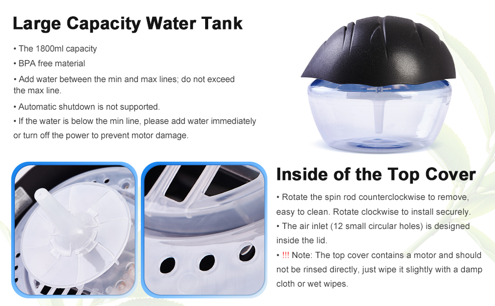 ☑️ التنظيف والعناية دون عناء: تم تصميم منقي الهواء هذا بالماء لسهولة العناية به. أقصى سعة 1800 مل، فقط عليك تنظيف الزجاجة كل يوم. ما عليك سوى التخلص من المياه المستخدمة يوميًا وإعادة ملئها بالمياه العذبة والزيوت الأساسية. قم بإزالة العمود المركزي واغسله بالماء والصابون لتنظيف أعمق. يوصى بمسح الجزء الداخلي من الغطاء العلوي بمناديل مبللة أو خرق.