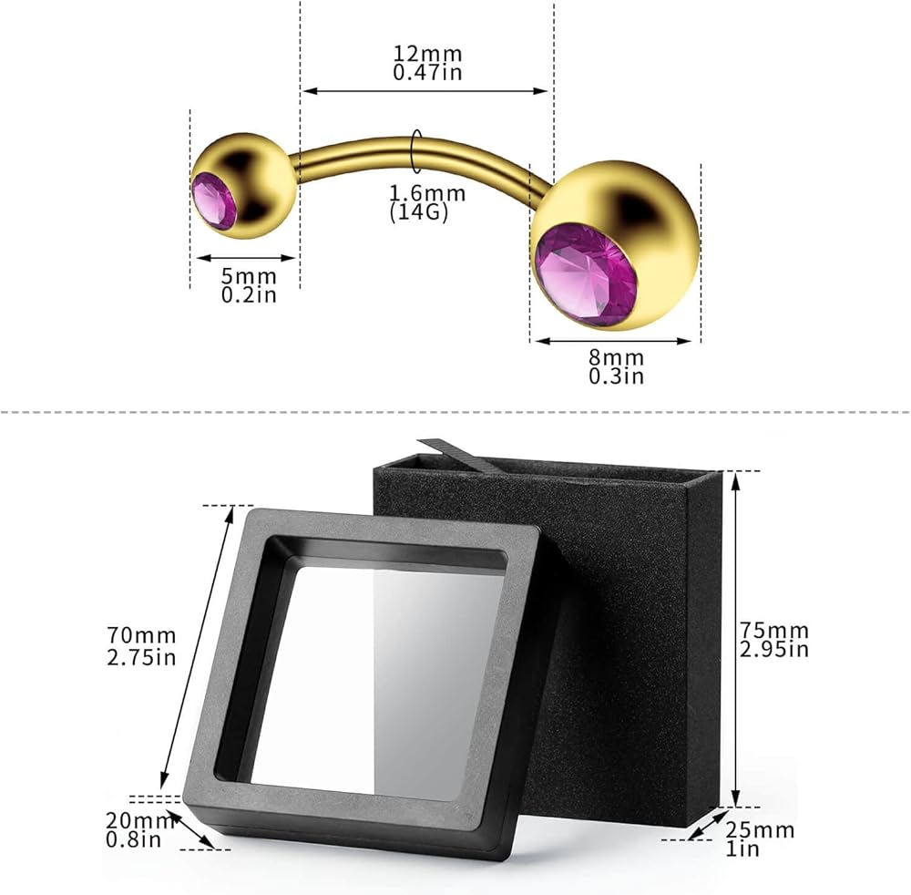 SIZE - There are 3 kinds of belly button rings in silver, gold and rosegold, and they are the same size.The bar thickness of banana barbells belly button rings=14 Gauge (1.6mm), length of belly ring: 0.87in(22mm), diameter of top ball: 5mm; diameter of bottom ball: 8mm. Proper size for most people to wear, easy to screw on and off.