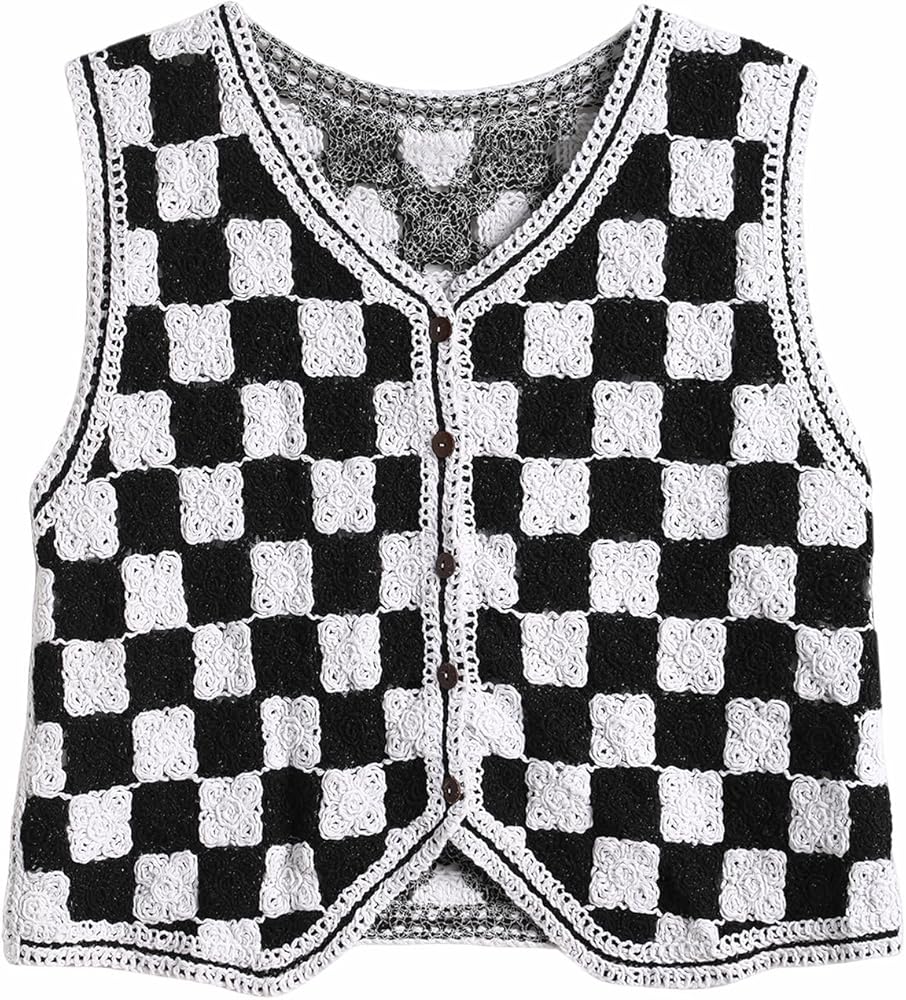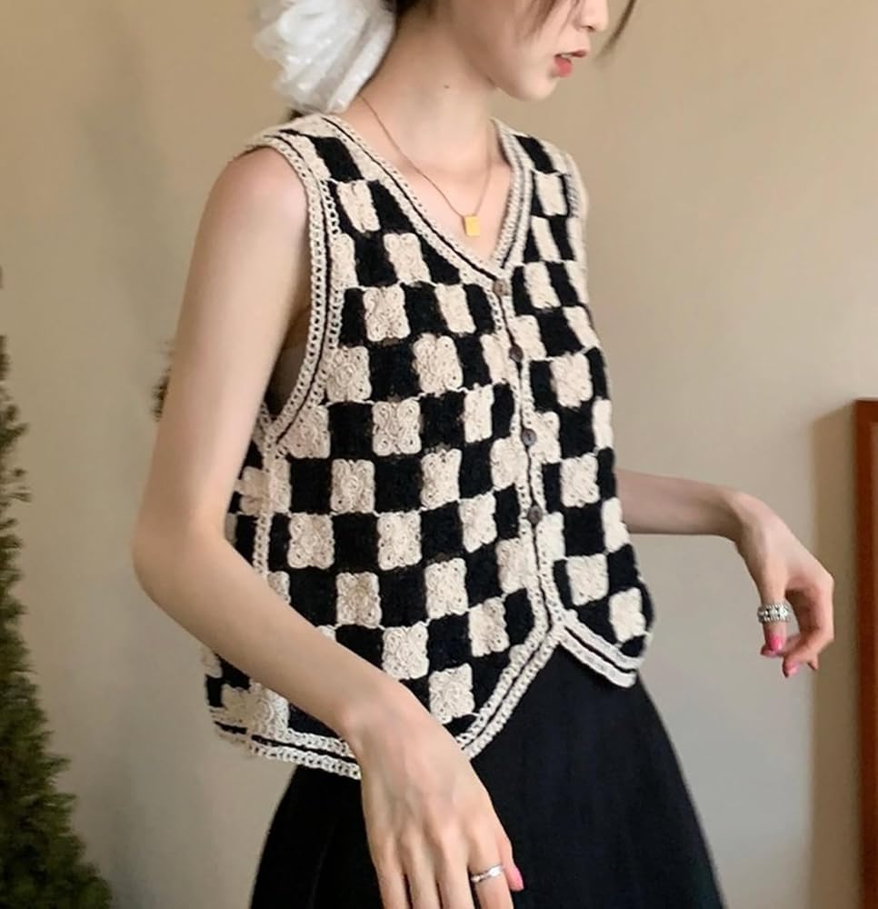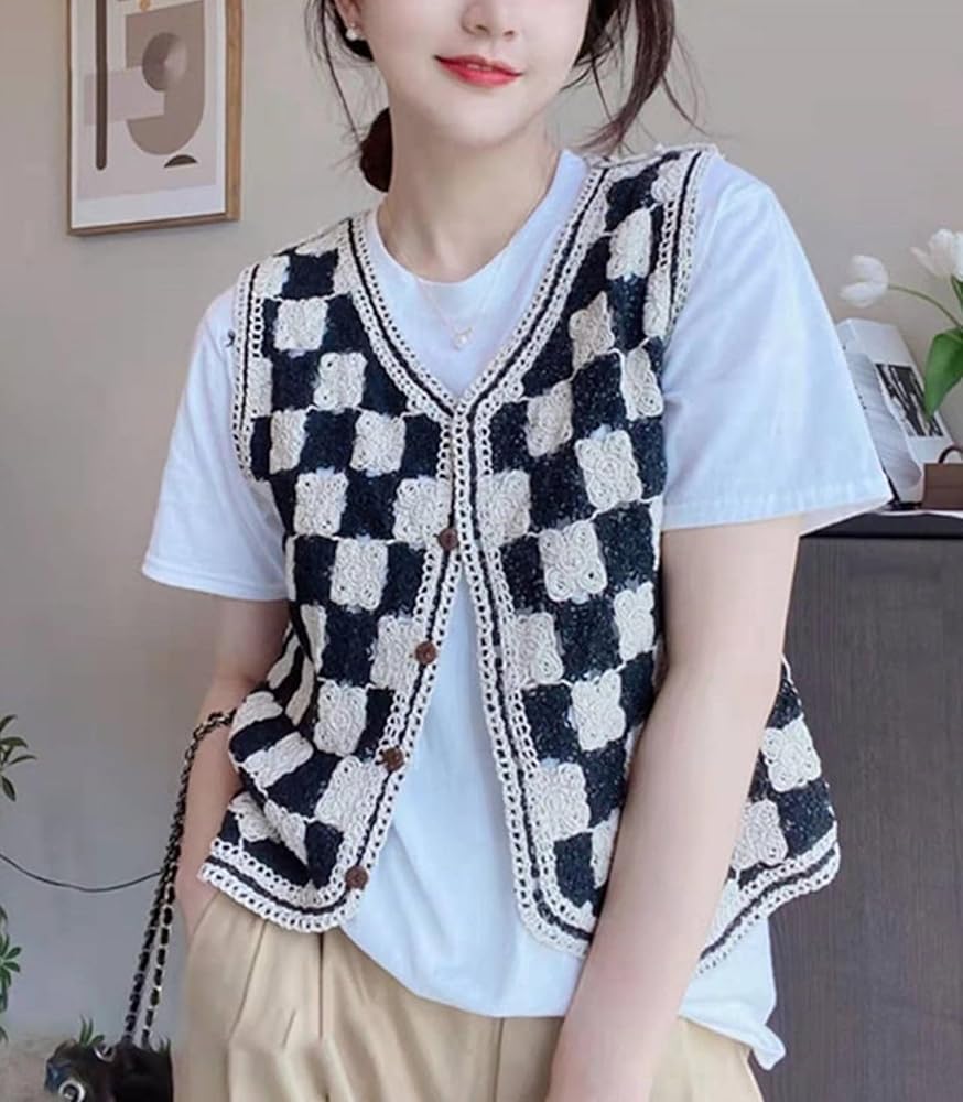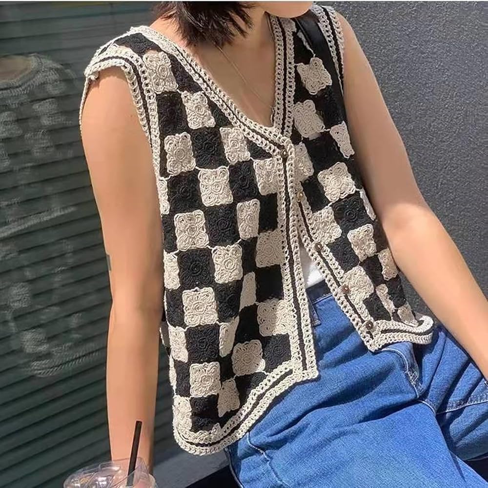 التصميم: سترة محبوكة بدون أكمام، رقبة على شكل حرف V، بدون أكمام، أزرار، نمط منقوش، حاشية غير متماثلة، سترة علوية قصيرة بدون أكمام.